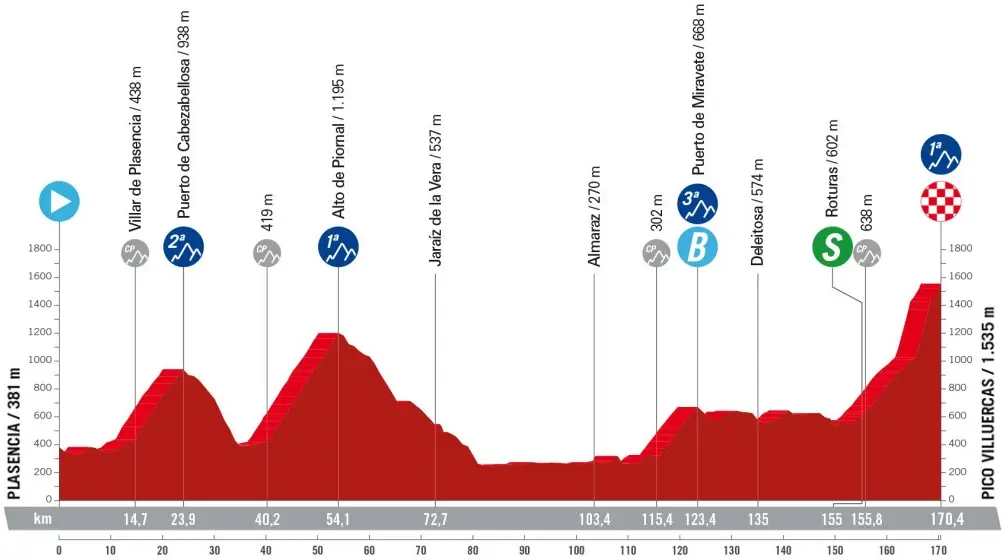 Alla Vuelta a España 2024 è il momento della prima frazione di montagna, destinata a decidersi sull'impennata finale, ma comunque non unipuerto in senso stretto. L'avvio della 4a tappa è subito mosso e dopo poco si incontra la salita al Puerto de Cabezabellosa (9.2 km al 5.4%, max 9% nel primo km), immediatamente seguita da quello all'Alto de Piornal (13.9 km al 5.6%, molto regolare, max 8%) con discese abbastanza insidiose. La gara a questo punto si addolcisce con 30 km di pianura prima di imboccare il Puerto de Miravete (8 km al 4.5%), praticamente privo di discesa. Un tratto ondulato porta ai piedi della salita finale, che inizia già prima del traguardo volante di Roturas, a oltre 17 km dal traguardo (contro i 14.6 km ufficiali); da qui la media sarebbe del 5.8%, ma il dato nasconde molto di più: i primi 9 km sono al 4.3% di media, piuttosto regolari (a parte qualche breve tratto più arcigno), poi la pendenza cala ulteriormente nei successivi 3 km abbondanti (media 3.1%), prima di imboccare la tremenda impennata su cemento che porta al Collado de Ballesteros in 3 km al 13.2% (max 20%); rimangono quindi poco più di 2 km irregolari (media 5.7%), che alternano falsopiani ad altre toccate in doppia cifra (max 15% in prossimità del traguardo).