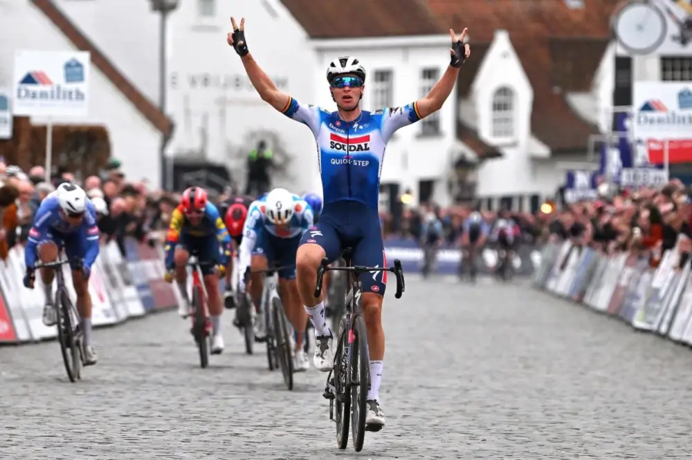 Il belga della Soudal Quick-Step vince nettamente in volata sul Nokereberg, vincendo per il terzo anno di fila. Sul podio anche Jakobsen e Philipsen