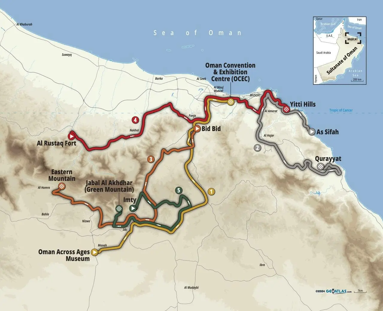 In Oman vengono confermati in maniera quasi speculare (ma non perfettamente identici) i percorsi del 2023 anche per la Muscat Classic e il Tour of Oman 2024. La classica di apertura presenta un tracciato perfettamente identico all'anno passato, composto dal susseguirsi di salite brevi ma molto ripide; a seguire si corre il Tour of Oman su 5 tappe, mantenendo tutte le sedi di tappa del 2023, con qualche variazione sul tracciato. La prima tappa sarà l'unica da volata, mentre le altre arrivano di fatto tutte in salita, offrendo una certa varietà nella difficoltà delle asperità proposte (brevi strappi, rampe da garage e salite vere).