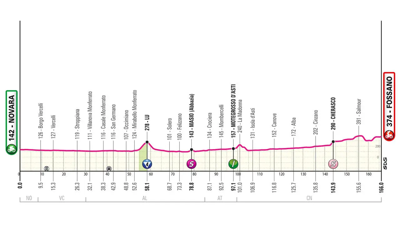 Dopo una partenza al fulmicotone, il gruppo può respirare e alla terza tappa del Giro d'Italia, i velocisti trovano la prima occasione da sfruttare. Da Novara a Fossano il percorso è decisamente semplice, con poche ondulazioni attraversando il Monferrato, tra cui il GPM di Lu (3.4 km al 3.8%, max 8%). Il finale è leggermente più mosso, a partire dallo strappo che porta allo sprint con abbuoni posto nel centro di Cherasco (800 metri all'8%) a 22 km dall'arrivo. La strada procede in falsopiano, con un altro facile zampellotto prima di Salmour ad una dozzina di km dal traguardo; quindi discesa e dopo il ponte sulla Stura di Demonte inizia una salita di 1.5 km al 5.3% molto regolare che termina nel centro di Fossano esattamente a 3 km dall'arrivo. Niente di trascendentale, ma comunque un ostacolo di cui tenere conto nell'organizzazione della volata che potrebbe venir fuori un po' convulsa. Questi 3 km sono poi perfettamente pianeggianti, con una sola curva a gomito a sinistra prima del lungo rettilineo finale di 1300 metri.