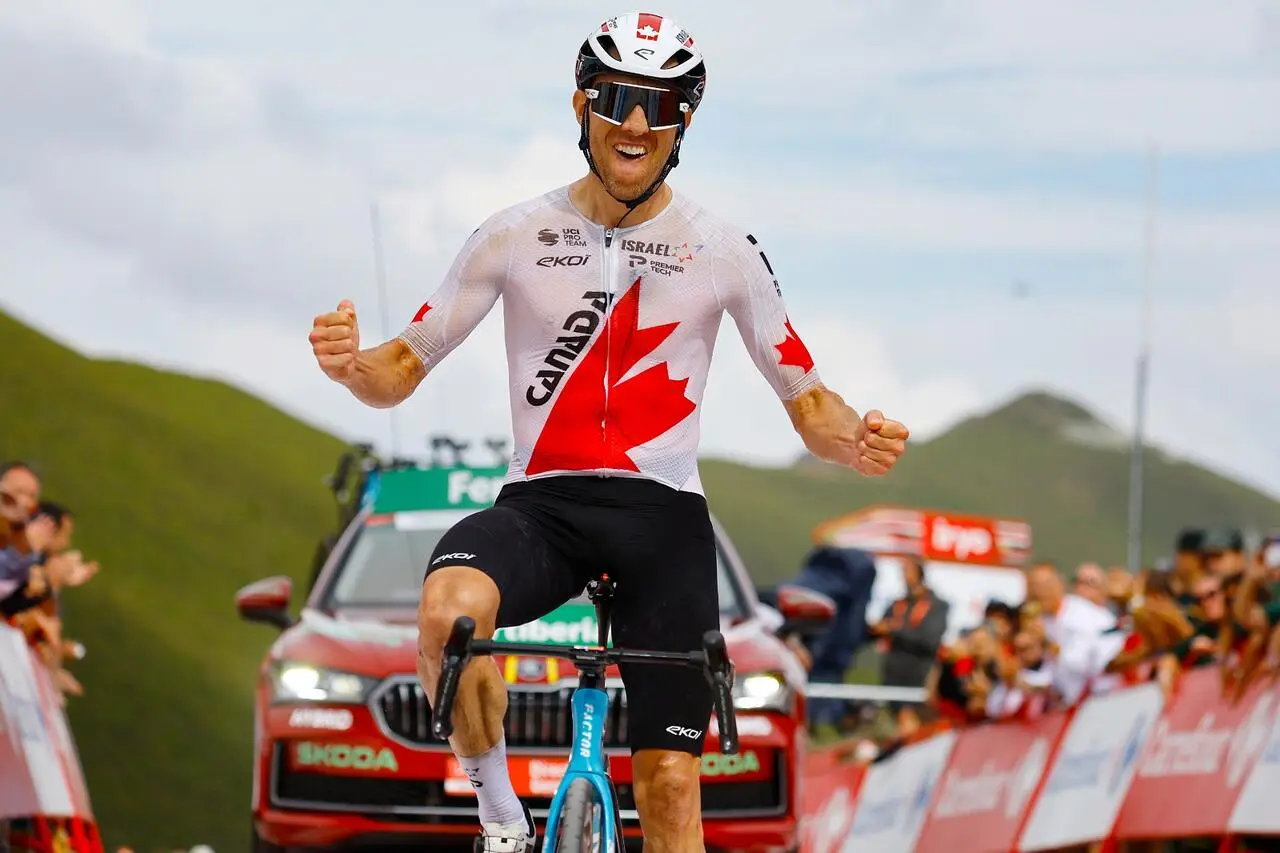 Altra fuga vincente nella tredicesima tappa: il 37enne canadese stacca Schmid e Soler, Roglič si porta a 1'20" dalla maglia rossa. Vergallito buon nono