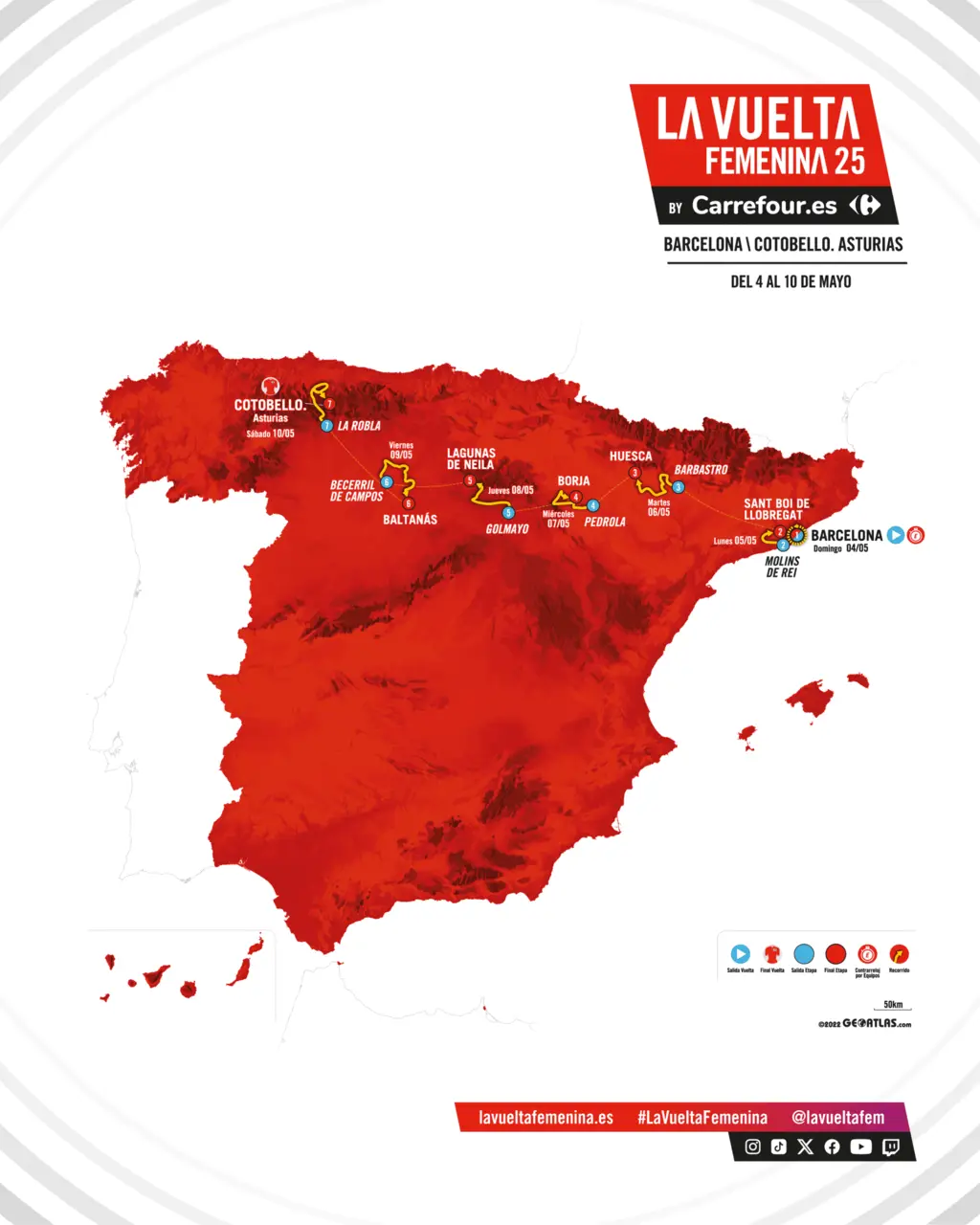 La Vuelta a España al femminile torna a corrersi su 7 tappe, una in meno del 2024. Il percorso de La Vuelta Femenina 2025 ripropone le caratteristiche delle ultime edizioni, aprendosi con una cronometro a squadre per poi essere decisa da tre frazioni in montagna negli ultimi quattro giorni, la prima con arrivo in discesa, le altre due con arrivo in quota. Pur mancando una salita veramente iconica, rispetto all'anno passato ricompaiono pendenze molto cattive, nonché tappe che si prestano anche a muoversi prima dell'ultima salita.