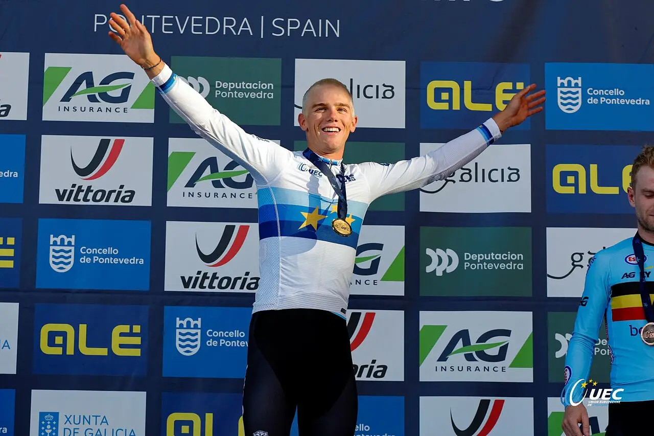 Thibau Nys sul podio dei Campionati Europei di Ciclocross a Pontevedra 2024 © UEC Cycling via X