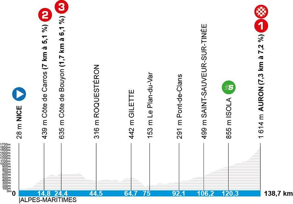 È il momento della tappa di montagna, con il traguardo in quota di Auron, che non sarà preceduto da altre montagne, come avvenuto l'anno scorso dopo il taglio del Col de la Colmiane per neve. Si parte praticamente in salita, con le prime pendenze che arrivano dopo meno di 10 km per superare la Côte de Carros e la Côte de Bouyon, seguita da un tratto ondulato in quota che si chiude con la salitella verso Gilette. Qui inizia la lenta risalita della valle della Tinée. In un certo senso si può dire che si sta già iniziando a salire verso il traguardo, considerando che già dopo Saint-Saveur-sur-Tinée il falsopiano si fa piuttosto esigente (circa 25 km al 2.5% di media) e affaticherà moltissimo le gambe prima della salita vera e propria di 7.3 km al 7.2%. Il tratto più duro è misurabile in circa 3.5 km all'8.3% e termina in vista dell'ultimo km, leggermente più semplice (6/7%).