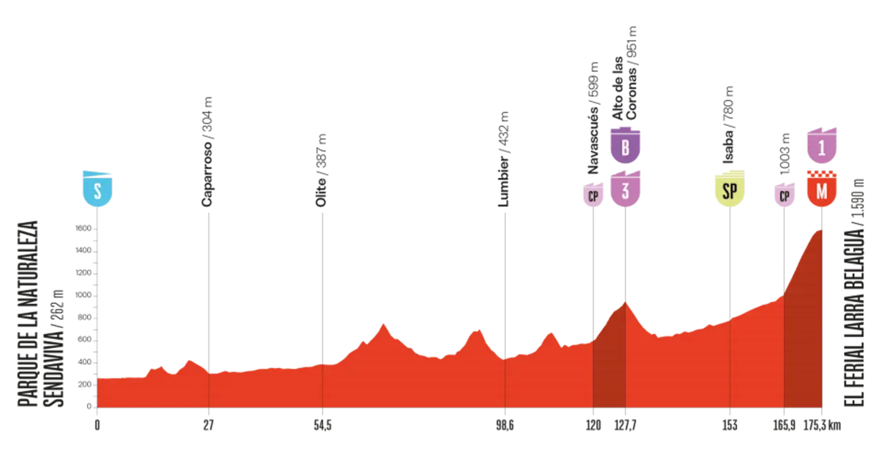 La seconda settimana della Vuelta a España 2025 riparte come la precedente si era conclusa, con una 10a tappa un po' buttata lì, con alcune semplici salite a precedere un arrivo in quota a sua volta non durissimo dove potrebbe non succedere niente. Due salitelle di 2 km al 4.5% e 2.8 km al 4.3% (max 10%) aprono la tappa; si deve poi attendere la fase centrale per incontrare le prime vere asperità: Alto de Lerga (10.5 km al 3.4%, max 9%), Alto de Aibar (circa 6 km al 4%, max 8%), Alto de Iso (circa 4 km al 4.5%) e Alto de las Coronas (ignorando il dato ufficiale, 7.3 km al 4.7%, max 8%). Dopo la discesa circa 30 km di fondovalle precedono la salita finale di Larra Belagua (9.4 km al 6.3%): in verità sono di salita tosta i primi 7 km (media 7.6%, max 10%), cui segue un km pedalabile (4/5%) e gli ultimi 1400 metri quasi pianeggianti.