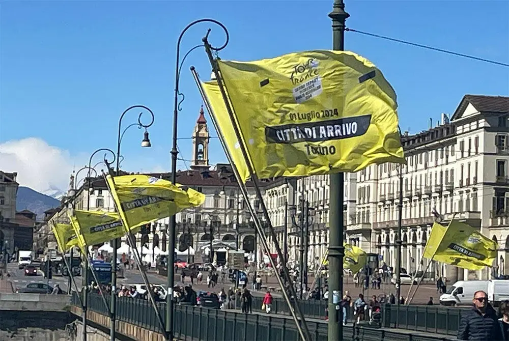 Le gialle bandiere garriscono al vento, riflettendo un intenso sole primaverile. Come spesso accade, i drappi appesi sul ponte sul Po in Piazza Vittorio Veneto a Torino ricordano ai torinesi e forestieri i prossimi grandi eventi in città. A cento giorni dal Grand Départ del Tour de France in Italia, è il turno del giallo, simbolo del ciclismo nel paese transalpino.