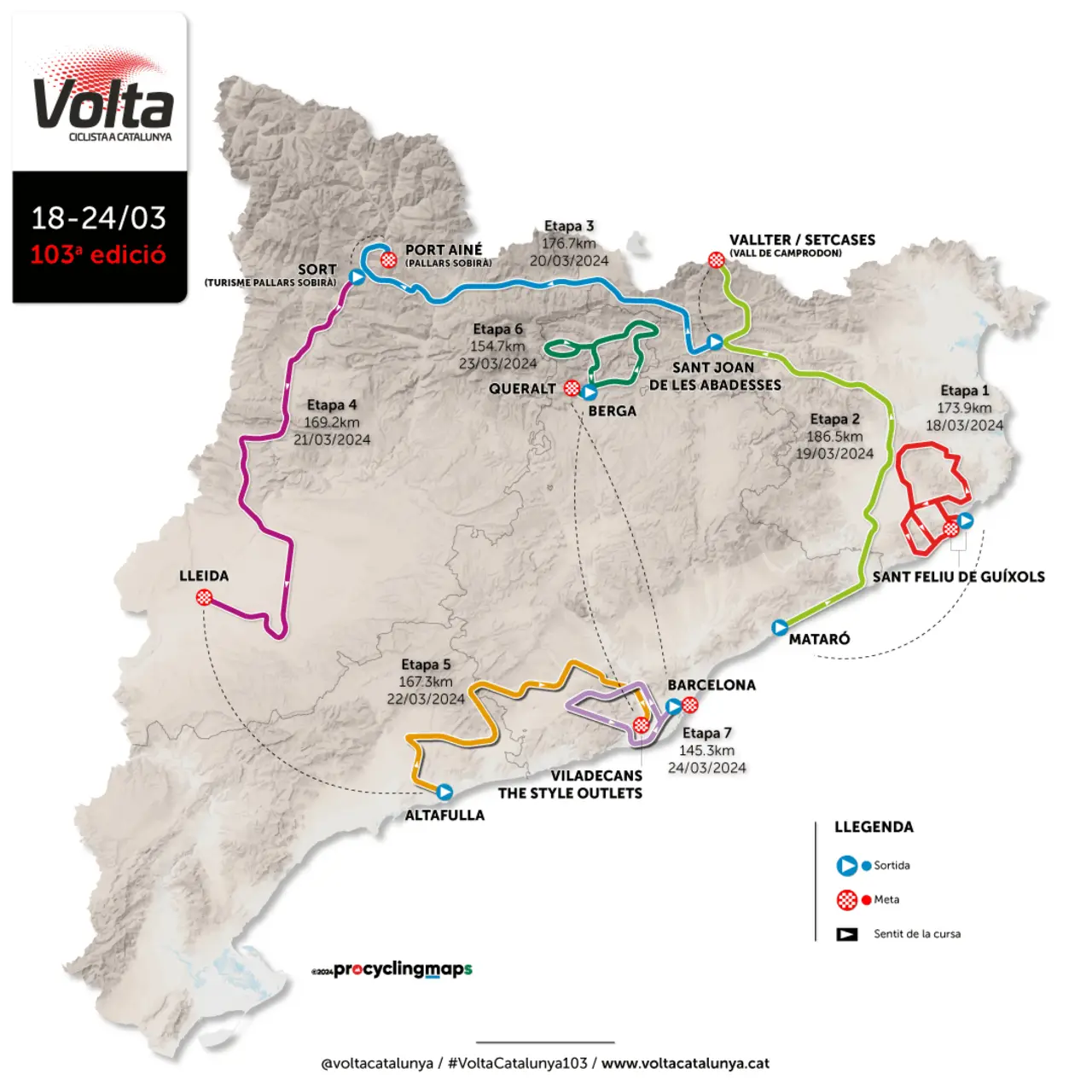 La Volta a Catalunya 2024 conserva la formula di 7 tappe tutte in linea, che alternano giornate vallonate rivolte a fughe e velocisti resistenti a tappe di alta montagna che fungono da perfetto antipasto per i Grandi Giri. Quest'anno in particolare sono 3 le giornate rivolte agli scalatori, tutte con arrivo in quota, ma tra loro molto diverse. C'è grande interesse soprattutto per la 6a tappa che fa debuttare nel grande ciclismo il temibilissimo Coll de Pradell, all'interno di una frazione che sarebbe stata a mani basse la più bella del Giro d'Italia. Delle restanti quattro giornate, almeno due possono comunque creare scompiglio in classifica, in particolare l'ultima con il duro circuito del Montjuic.
