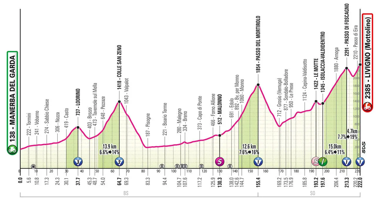 La seconda settimana si chiude con quella che in teoria è la tappa regina di questo Giro d'Italia; nella pratica è senz'altro la più dura ed estenuante, ma il tracciato non è pensato in modo particolarmente intelligente e potrebbe dare vita a dinamiche non frizzantissime, anche se nel finale i distacchi potrebbero senz'altro essere importanti. Per quanto non perfetatamente riuscito è a tutti gli effetti un tappone che in 222 km accumula oltre 5000 metri di dislivello superando anche la soglia dei 2000 metri di altitudine. Si parte subito in lieve ascesa con 30 km di fondovalle fino ai piedi della prima ascesa verso Lodrino (7.6 km al 4.2%, max 11%), seguita da una discesa tecnica e, in breve tempo, dalla dura salita al Colle San Zeno (13.9 km al 6.6%, max 14%; sale a gradoni con numerosi tratti in doppia cifra). Abbinata ai successivi 15 km di discesa insidiosa sarebbe un buon punto per fare confusione, ma il gruppo a seguire troverà la lunga risalita della Val Camonica, ovvero oltre 50 km di pianura e falsopiano dove invece è lecito immaginarsi decollare il vantaggio dei fuggitivi. Già ad Edolo la strada inizia a salire per quasi 5 km (4.3% di media) fino all'inizio formale del Passo del Mortirolo, che seppur affrontato dal suo versante meno nobile è pur sempre una signora salita di 12.6 km al 7.6% con rampe fino al 16%. Forse qui la corsa potrebbe entrare già più nel vivo anche per via della discesa estremamente tecnica, ma dalla vetta mancano ancora 67 km all'arrivo, 53 da fine discesa, forse troppi per attendersi qualcosa, anche perché a seguire c'è l'anomala risalita della Valtellina: si tratta di un fondovalle, ma di fatto nella prima parte è salita vera (12 km con una media del 3.3% con punte anche fino al 10%) anche se pedalabile ed è difficilissimo da interpretare; seguono poi 8 km quasi pianeggianti. Si torna a salire alle porte di Bormio verso il traguardo con abbuoni delle Motte (3.1 km all'8.1%, max 12%). Dopo una breve discesa e 3 km di fondovalle inizia subito la salita al Passo di Foscagno (14.6 km al 6.5%, punta del 12% nel primissimo tratto) di per sé pedalabile e poco stuzzicante, ma che dopo una tappa così dura potrebbe anche risultare sufficiente a mandare qualcuno in crisi, anche grazie al fattore altitudine. Chiunque si sentisse bene avrebbe certo più convenienza a scavare distacchi su una salita veloce ma pur sempre impegnativa come il Foscagno, piuttosto che aspettare la rampa da garage conclusiva dove guadagnerebbe solo pochi secondi. Infatti lo scollinamento del Foscagno avviene ad appena 8.7 km dall'arrivo e dopo 4 km di discesa, si torna a salite per gli ultimi 4.7 km al 7.6%: un primo tratto regolare di 2.9 km al 6.5% (max 9%) porta al Passo di Eira, dove si svolta a sinistra per l'inedita rampa finale del Mottolino di 1.8 km al 10% con punte fino al 19%. Si segnala che dopo aver superato quota 2000 metri a poco meno di 5 km dal traguardo, gli oltre 13 km che portano all'arrivo si svolgeranno interamente sopra questa soglia, restando in alta quota per una trentina di minuti.