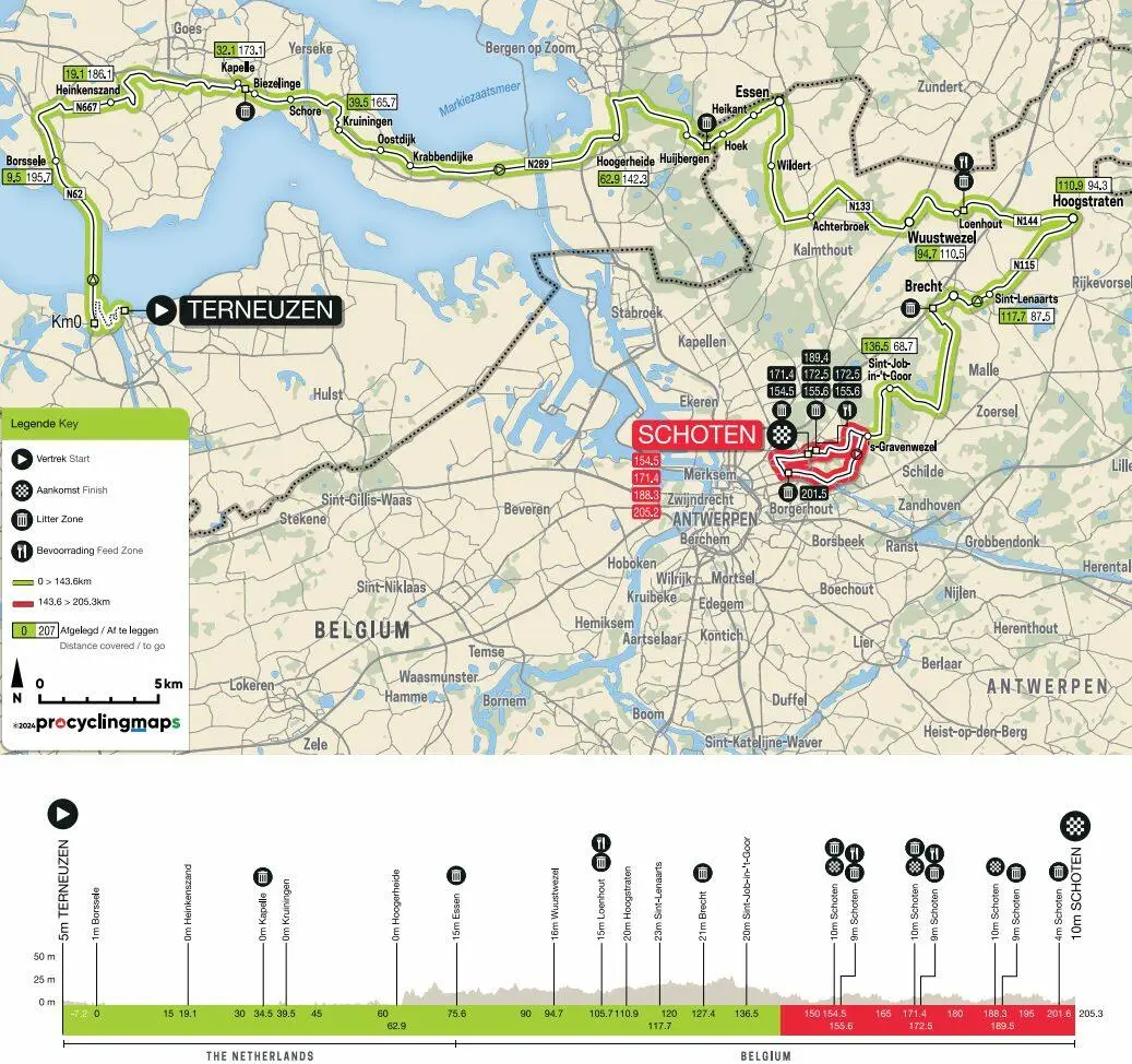 Incastonata nel calendario tra Giro delle Fiandre e Parigi – Roubaix, La Scheldeprijs è una delle corse più longeve nel panorama ciclistico internazionale visto che quest'anno si svolge l'edizione numero 112. Che sia una corsa particolarmente adatta ai velocisti si capisce leggendo l'albo d'oro e a Schoten, sede d'arrivo della corsa, si sono accumulate negli anni volate su volate che hanno visto prevalere gli sprinter più forti in circolazione. A partire dagli anni 90 possiamo elencare i nomi di Mario Cipollini, Erik Zabel, Wilfried Nelissen, Jeroen Blijlevens, Endrio Leoni, Robbie McEwen, Mark Cavendish, Alessandro Petacchi, Alexander Kristoff, Caleb Ewan, Fabio Jakobsen, Jesper Philipsen e Marcel Kittel, quest'ultimo detentore del record di vittorie, cinque in tutto. Prima ancora, la semiclassica belga è stata vinta da autentiche leggende di questo sport come Stan Ockers, Briek Schotte, Rik van Looy, Walter Godefroot, Roger De Vlaeminck, Freddy Maertens e naturalmente Eddy Merckx. La corsa è lunga complessivamente 205.3 km e ricalca pedissequamente il tracciato dello scorso anno con partenza da Terneuzen ed arrivo a Schouten. Nel finale si percorrerà per quattro volte un circuito conclusivo caratterizzato dal tratto in pavè di Broekstraat. Come al solito il vento potrebbe avere un ruolo importante ed i ventagli potrebbero sconvolgere la corsa anche se l'opzione della volata di gruppo compatto è quella più gettonata. Ai nastri di partenza sono presenti 22 squadre di cui undici WT, nove Professional e due Continental.