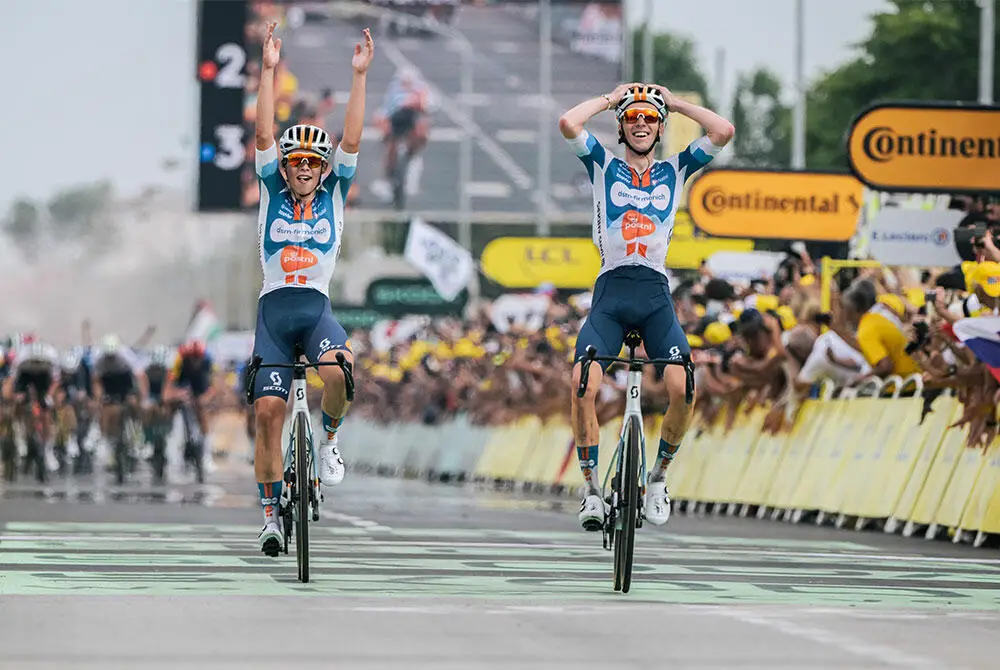 Inseguiti da un gruppo rabbioso, nel quale due e a tratti tre squadre spingevano a tutta per favorire i più resistenti tra gli uomini veloci (gente come Mads Pedersen o Wout van Aert), i due DSM hanno resistito in maniera - verrebbe da dire - epica, salvando la tappa per soli 5".