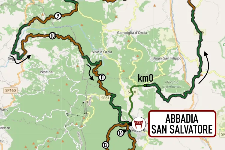 Si ripercorrono quindi i primi km del terzo settore (affrontando nuovamente la salita di Acquasalsa), per poi iniziare la lunga salita che porterà prima a Rocca d'Orcia - con uno spettacolare attraversamento su lastricato del centro storico e del vicino borgo di Castiglione d'Orcia - e poi a Poggio Cuculo, con successiva discesa quasi completamente su sterrato (settore 9).