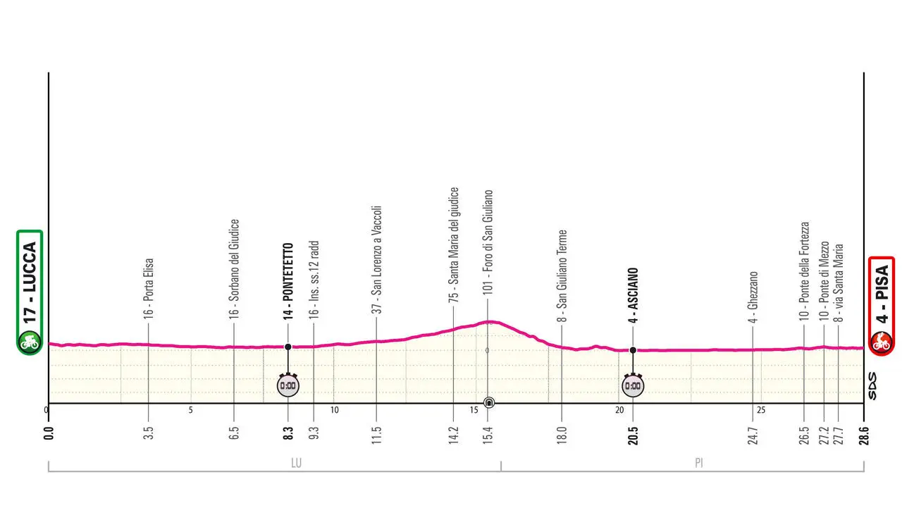 Al Giro d'Italia 2025 il giorno di riposo è alle spalle ed è il momento di ripartire con la 10a tappa. Non è certo lunghissima, ma si tratta comunque della crono più importante del Giro, una prova per specialisti che scriverà la classifica con cui ci si approccerà alle vere montagne a partire già - in parte - dal giorno successivo. Una crono delle meraviglie tra altre due splendide città d'arte toscane, che prenderà il via dai bastioni delle mura di Lucca, le quali saranno percorse per quasi 3 km in avvio. I primi 8 km sono proprio i più tecnici, a causa dello strappo in avvio per salire sulla mura, la discesa con due tornanti per tornare in città e il successivo tratto in periferia che presenta una dozzina di curve in poco più di 4 km. A Pontetetto lo scenario è completamente cambiato: da qui fino a Pisa il tracciato sarà su strade ampie e rettilinee; cambiano le carte in tavola solo il falsopiano fino al Foro di San Giuliano e la successiva discesa con 4 larghissimi tornanti che si dovrebbero affrontare bene anche con una bici da cronometro. Soltanto entrati dentro il centro storico di Pisa, dopo quasi 20 km velocissimi, il tracciato torna più complicato con 5 curve in meno di 2 km.
