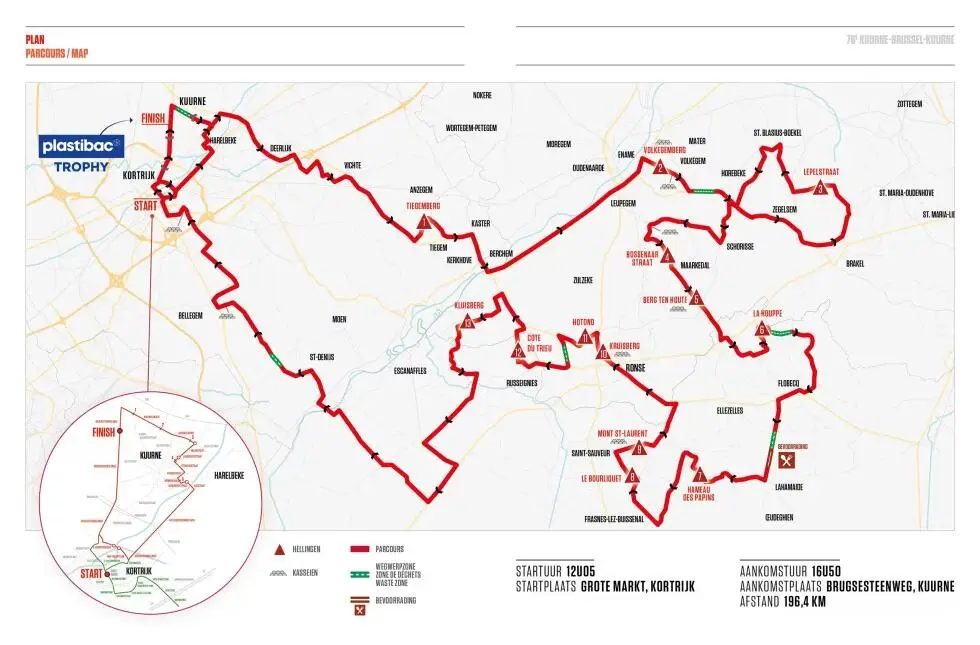 Rispetto al 2023 si segnalano poche variazioni nella Kuurne – Bruxelles – Kuurne, giunta quest'anno alla sua 76° edizione. Cambia la partenza – Kortrijk invece di Kuurne – ed il percorso è complessivamente lungo 196.4 km, 3 km in più rispetto allo scorso anno. I ciclisti sono attesi da cinque settori in pavè e da dodici muri. Questi ultimi sono inaugurati dal Tiegemberg dopo 17 km mentre l'ultimo sarà il Kruisberg al km 135, ad oltre 60 km dalla conclusione. La KBK si caratterizza da sempre per essere una corsa imprevedibile. Lo spartito tattico varia spesso e negli anni si sono alternati arrivi in volata, più o meno ristretta, ma anche assoli da parte di finisseur. Ne sono due fulgidi esempi proprio le ultime due edizioni. Nel 2022 Fabio Jakobsen vinse in volata in un gruppo che comprendeva una sessantina di unità mentre nel 2023 Tiesj Benoot fu il più lesto nel regolare un drappello di cinque uomini con il gruppo principale attardato. Anche il meteo, come la maggior parte delle corse che si disputano in Belgio in questo periodo, può influire sull'esito della corsa e per domani le previsioni danno pioggia per tutta la giornata.
