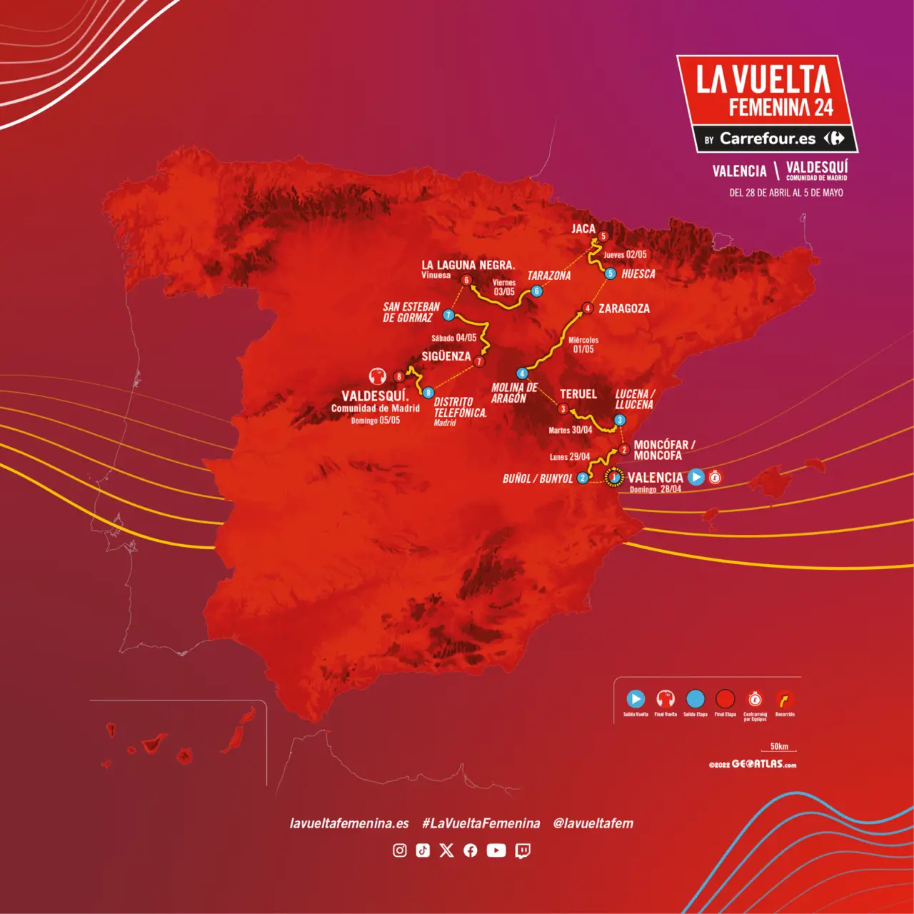 Continua la fase d'espansione della Vuelta al femminile e sale a quota 8 tappe come Tour e Giro. La Vuelta Femenina 2024 ripropone le caratteristiche dell'edizione passata, aprendosi con una cronometro a squadra per poi essere decisa da tre frazioni in montagna, quest'anno tutte con arrivo in quota. Le pendenze rispetto al 2023 sono mediamente più blande e manca una salita totem come potevano essere i Lagos; sarà più difficile fare la differenza ma questo potrebbe anche essere un vantaggio per lo spettacolo.