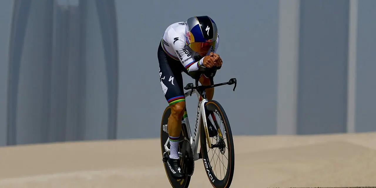 Frazione a cronometro completamente piatta di 12.2km tutta corsa sull'isola di Al Hudayriyat: lunghi rettilinei e curve prevalentemente ampie, con due soli punti più critici nella seconda metà del tracciato, rendono lo sforzo adatto agli specialisti capaci di spingere grandi wattaggi. Il campione del mondo Remco Evenepoel approfitta della possibilità di partire tra i primi per concedersi un po' di extra riposo sulla hot seat: il belga stacca infatti subito il miglior tempo in 13'03" con una media oraria di 56.1km/h. Partono a ridosso di Evenepoel anche gli specialisti Rémi Cavagna, Joshua Tarling e Ethan Hayter (Soudal Quick-Step): i tre si piazzano prevedibilmente alle spalle del campione del mondo, con Tarling che riesce ad arriva a soli 6". Ottimo tempo anche per l'ormai esperto francese (+12"), mentre il campione nazionale inglese Hayter si piazza quarto a 25" da Evenepoel.