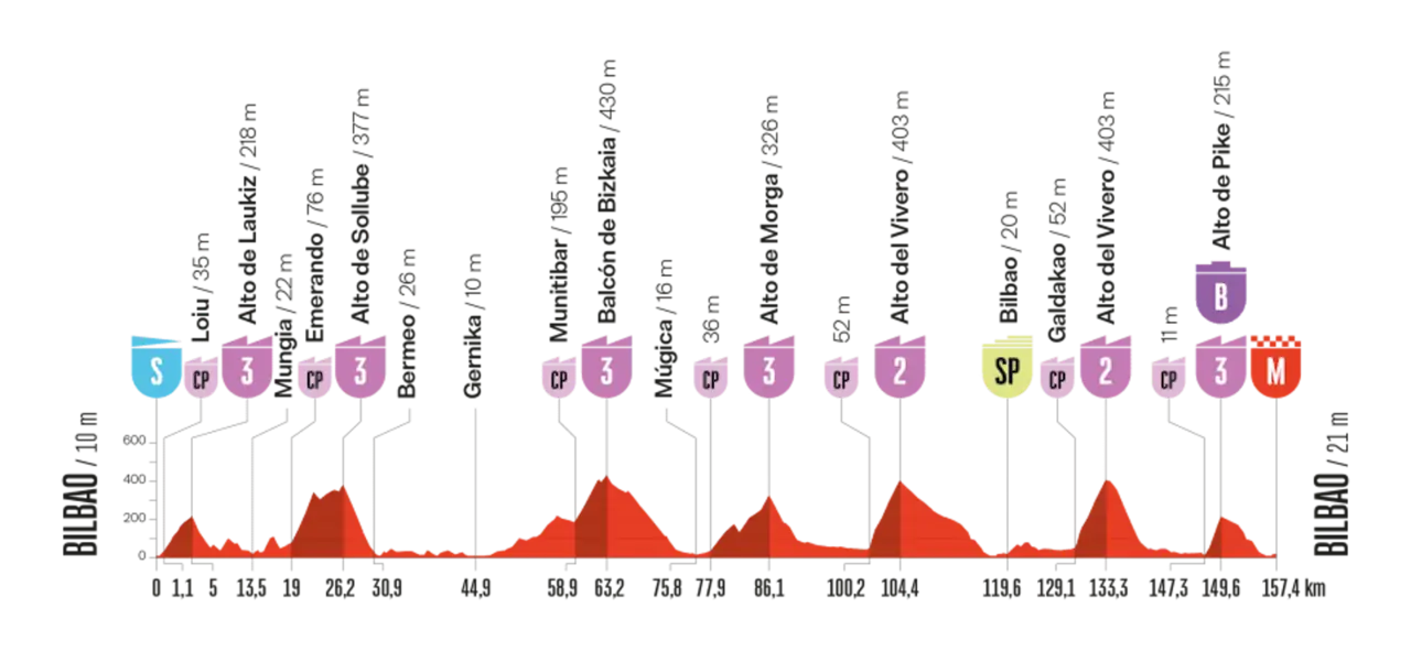 L'11a tappa è una delle più intriganti della Vuelta a España 2025, con partenza in salita e pendenze cattive sparse qua e là, per un totale di circa 3000 metri di dislivello. Pronti via si supera l'Alto de Lakuiz (3.9 km al 4.7%), seguito dagli strappi di Botiola (1 km al 6%) e Elordigane (1.4 km al 6.8%), quindi la prima salita dura verso l'Alto de Sallube: il dato di 7.2 km al 4.2% nasconde un primo tratto di 3.2 km all'8.5% (max 10%), seguito da una breve discesa e un tratto ondulato fino in vetta. Al termine della discesa si incontra un tratto agevole, ma comunque mosso e mai del tutto pianeggiante, di oltre 20 km; una prima asperità di 3 km al 4% precede la salita al Balcón de Bizkaia (4.3 km al 5.4%; primi 3.2 km al 6.8%, max 10%), quindi l'Alto de Gerekiz (circa 3 km al 5%) e l'Alto de Morga (4 km al 4.7%, max 8%; ufficialmente è unito in 8.2 km con la salita precedente). A fine discesa si incontrano 10 km pianeggianti per entrare nel vivo della corsa con il primo passaggio sull'Alto del Vivero (salita irregolare di 4.2 km all'8.3% con un paio di passaggi al 15%). Una lunga discesa porta a Bilbao, dove si percorrerà lo strappo verso il traguardo (400 metri al 6%) e altre ondulazioni uscendo dalla città (2.3 km al 3%, max 10%). Bastano 5 km di pianura per salire di nuovo l'Alto del Vivero, con scollinamento a 24 km dall'arrivo. Dopo la discesa si pedala in pianura per soli 9 km, quindi la strada impenna di nuovo verso l'Alto de Pike (2.3 km all'8.9%, max 16%), che termina a meno di 9 km dall'arrivo. La discesa (da pedalare) termina a poco più di 1 km dal traguardo; si riaffronta lo strappetto nel centro di Bilbao, poi la strada spiana nei 500 metri finali.