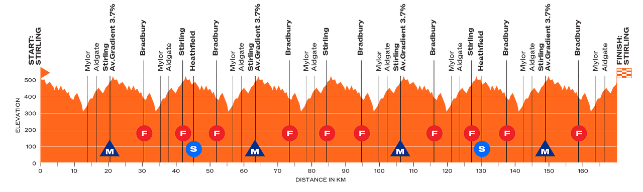 Quest'anno la frazione finale non sarà pianeggiante, ma al tempo stesso nemmeno una tappa importante per la generale come quelle viste a Mount Lofty negli anni passati. Si tratta del classico circuito di Stirling che ha a lungo fatto parte del tracciato di questa corsa fino al 2019. L'intera tappa si svolge nel circuito, che viene percorso per 8 volte. Di fatto non ci sono tratti pianeggianti, ma al contempo nemmeno salite sufficientemente impegnative per poter attaccare e modificare la classifica, anche se in questo momento della stagione la condizione dei corridori è ancora precaria e potrebbero esserci sorprese nel serrato susseguirsi di saliscendi. I primi 13 km sono prevalentemente a scendere (ma anche questi mossi), poi si sale ad Aldgate (in tutto 3.7 km al 3.6%, anche se la media è falsata da un tratto centrale pianeggiante). Una breve discesa precede l'ulteriore tratto di salita che porta al traguardo (2 km al 3.7%) e prosegue quasi un altro km oltre. Le pendenze più sensibili si incontrano forse proprio nei 500 metri che precedono l'arrivo (5-6%).