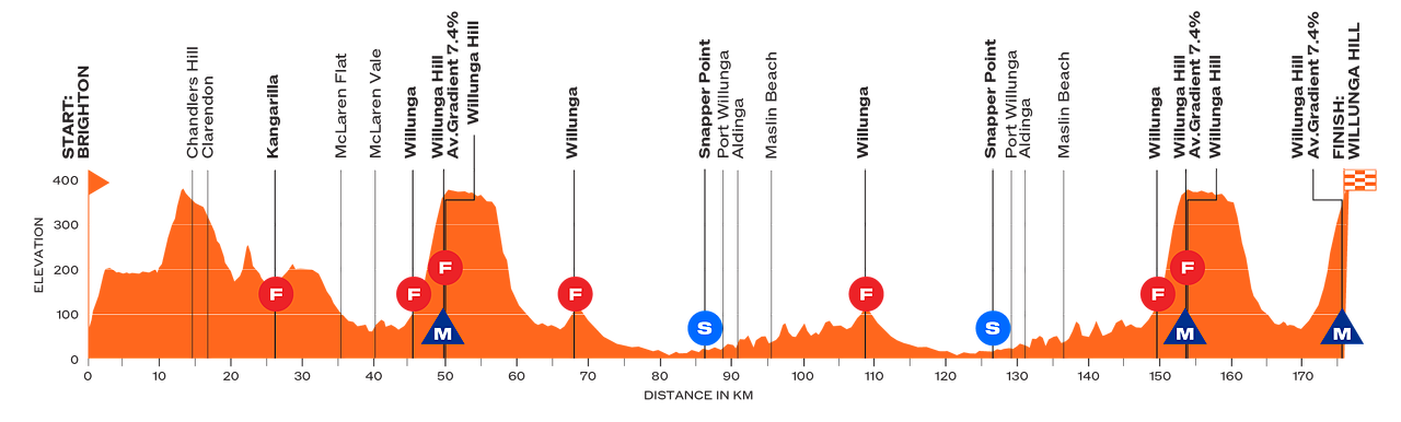 L'iconica ascesa a Willunga Hill sarà il giudice finale della corsa, ma stavolta verrà scalata addirittura tre volte. con successivo transito dal traguardo in senso contrario. L'avvio è molto simile alla tappa precedente, con una prima salita di 2.3 km a 6% dopo il km0, seguita poi da Chandlers Hill (2.8 km al 6%) e un altro strappo meno pronunciato prima di Kangarilla. Con 20 km semplici si raggiunge Willunga e si sale una prima volta al traguardo di Willunga Hill. Una volta scesi, si percorrono due giri di un circuito fondamentalmente pianeggiante, ma lievemente ondulato nel tratto che riporta in città. La strada sale già in falsopiano (3% circa) fino a Willunga stessa, dove alla fine del secondo giro si riprende la strada per il traguardo, che si fa più arcigna per circa 3.5 km al 7.4%: i primi 1500 metri sono i più duri (8.5% di media), poi la pendenza si stabilizza al 6/7% fino a diventare falsopiano nelle ultime centinaia di metri prima del traguardo. Inizia quindi il giro finale di circa 23 km, con il quale si scende per poi salire una terza volta a Willunga Hill, dove si chiuderà la tappa.