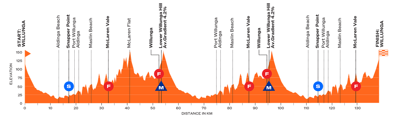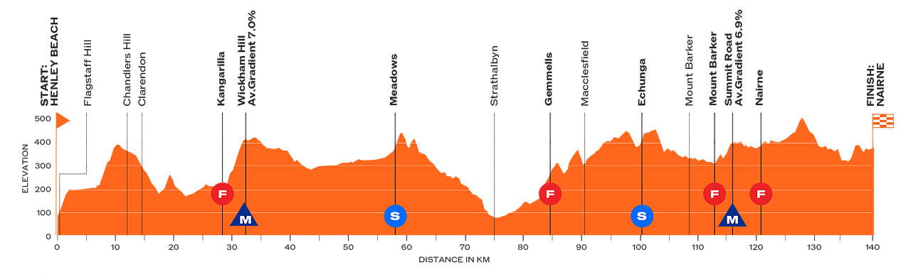 Tracciato nuovo, molto movimentato, ma probabilmente destinato a chiudersi comunque con una volata a ranghi compatti. Si parte in salita per superare Flagstaff Hill (circa 2 km al 6.5%), seguita presto da Chandlers Hill (2.8 km al 6%). Dopo altre ondulazioni minori si sale a Wickham Hill (3 km al 7%), chiudendo un primo tratto molto impegnativo. I successivi 25 sono pianeggianti, seguiti da una salitella dopo il traguardo volante di Meadows e una lunga discesa da pedalare. A questo punto si percorrono 30 km mossi, prevalentemente in salita, fino al traguardo volante di Echunga, che senz'altro appesantiscono le gambe dei velocisti ma non sembrano realmente offrire terreno per staccarne qualcuno. Dopo altri 10 km pianeggianti si incontra il GPM di Mount Barker (circa 3 km al 3%, spezzati da una discesa; ultimi 500 metri al 7%), che precede di poco il primo transito dal traguardo. Inizia quindi il circuito finale di circa 10 km con lieve ondulazioni: un'ultima salitella di circa 2 km al 3.5% termina a meno di 3 km dal traguardo e può complicare le cose.