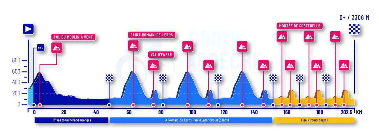 Come per le colleghe, si parte in salita con il Col du Moulin à Vent (circa 4 km al 5%), seguito da una lunga discesa e oltre 30 km fondamentalmente pianeggiante fino al primo passaggio sulla linea del traguardo. Qui si percorrono tre giri lunghi seguiti da tre brevi. Questo significa che il Saint-Romain-de-Lerps sarà scalato per l'ultima volta a circa 70 km dal traguardo, tanti, ma comunque meno dei 100 abbondanti che mancavano dal Mont Kigali al traguardo del mondiale. In totale si sommano circa 3300 metri di dislivello in poco più di 200 km.
