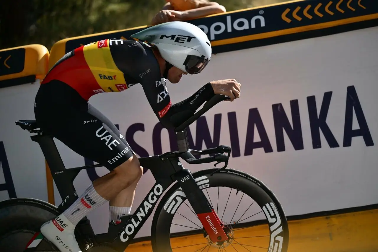 Cronometro tranquilla, invece, per Thibau Nys (con tanto di wheelie finale), che cede senza troppi patemi la maglia di leader a Jonas Vingegaard, seguito a 24" dal compagno Keldermann e a 25" da Diego Ulissi (UAE Emirates).