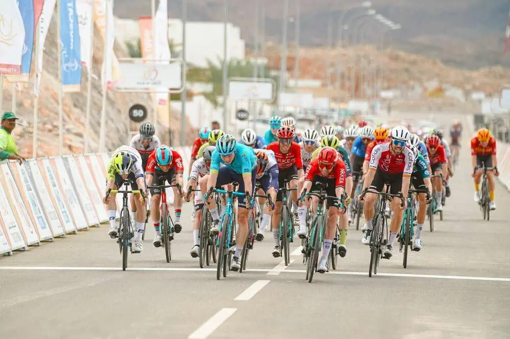 Carter Bettles (Rooijai Insurance) ha tentato di riportarsi sui battistrada, ma ha mancato di poco l'intento, dato che i tre avevano ripreso a pedalare benino, riportandosi a più un minuto sul gruppo. Che fossero destinati a essere ripresi era nell'ordine naturale delle cose, e infatti ai -14 c'è stato il ricongiungimento da parte del plotone tirato dai Soudal e approdato intanto sulla salitella di Al Jissah, sulla cui cima (ai -11) c'erano in palio gli abbuoni del secondo sprint intermedio della giornata.