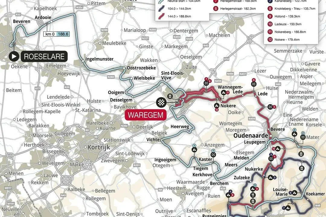 Rispetto agli anni precedenti, il circuito intorno a Waregem sarà compiuto in senso inverso: negli ultimi 30 km i corridori incontreranno i ciottoli di Doorn, Huisepontweg e Herlegemstraat (due volte) e ovviamente il Nokereberg (lo stesso muro finale della Nokere Koerse).