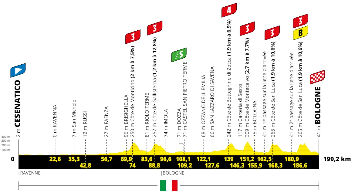 La 2a tappa del Tour de France 2024 è una frazione lunga ed insidiosa dove si può veramente iniziare a scrivere la classifica. Nel complesso è sicuramente meno tosta della precedente (appena 1500 metri di dislivello), ma i due passaggi a San Luca nel finale potrebbero essere sufficienti a sparigliare le carte. Dopo 70 km pianeggianti si incontra una prima salitella per attraversare il centro storico di Brisighella, quindi le prime due asperità, subito molto cattive, ovvero il Monticino (2 km al 7.5%, max 11%) e la Cima Gallisterna (1.3 km al 10.9%, max 14%). Dopo essere scesi a Imola e aver percorso per un tratto il circuito automobilistico, inizia un nuovo tratto pianeggianti di circa 40 km, che porta alla fase decisiva di corsa. Adesso infatti rimangono 4 salite insidiose tra loro piuttosto vicine in cui si può aprire il gas, partendo dallo strappo da Botteghino di Zocca a Tagliacane (1.9 km al 6.9%, seguiti da 2 km ancora in lieve ascesa) separato da soli 5 km di pianura dalla successiva salita a Montecalvo (2.7 km al 7.7%, con un tratto centrale di 1.4 km al 10%). La discesa porta direttamente alla periferia di Bologna e bastano 12 km di pianura per arrivare ai piedi del primo passaggio dal San Luca (1.9 km al 10.6%, max 19%), seguito subito dalla contropendenza di Monte Albano (circa 1 km al 5.5%) e dalla tecnica discesa su Bologna. In soli 9 km si è ai piedi del secondo passaggio, mentre alla fine della discesa ne mancheranno meno di 6 per arrivare al traguardo. C'è da attendersi qualche attacco importante su una salita che notoriamente crea notevoli difficoltà.