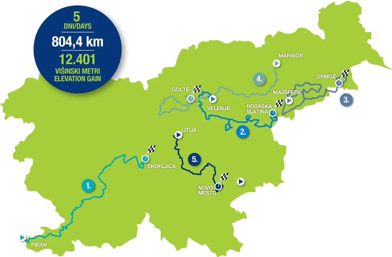 Come da tradizione degli ultimi anni la corsa si chiude a Novo Mesto, con una tappa ancora potenzialmente pericolosa. A complicare le cose ci pensano subito tre toste salite nei primi 45 km: Vace (5.9 km al 5.9%, ultimi 3 km al 7.5%), di nuovo la stessa da un diverso versante (2.6 km al 7.3%, con i primi 500 metri sopra il 10%) e un po' più avanti quella di Bogenšperk (3.9 km al 6%, con un tratto di 1.5 km all'8%). Dopo una fase centrale pianeggiante, si incontra la salita a gradoni di Trebelno (4.5 km al 5.9%, con pendenze sopra il 10% nel primo km). Tuttavia il punto chiave sarà, come di consueto, l'impegnativo strappo di Trška Gora (1.7 km al 10.5%, con punte poco sotto il 20%), posto a meno di 10 km dal traguardo. Se la classifica fosse ancora aperta, qui c'è modo di ribaltarla.