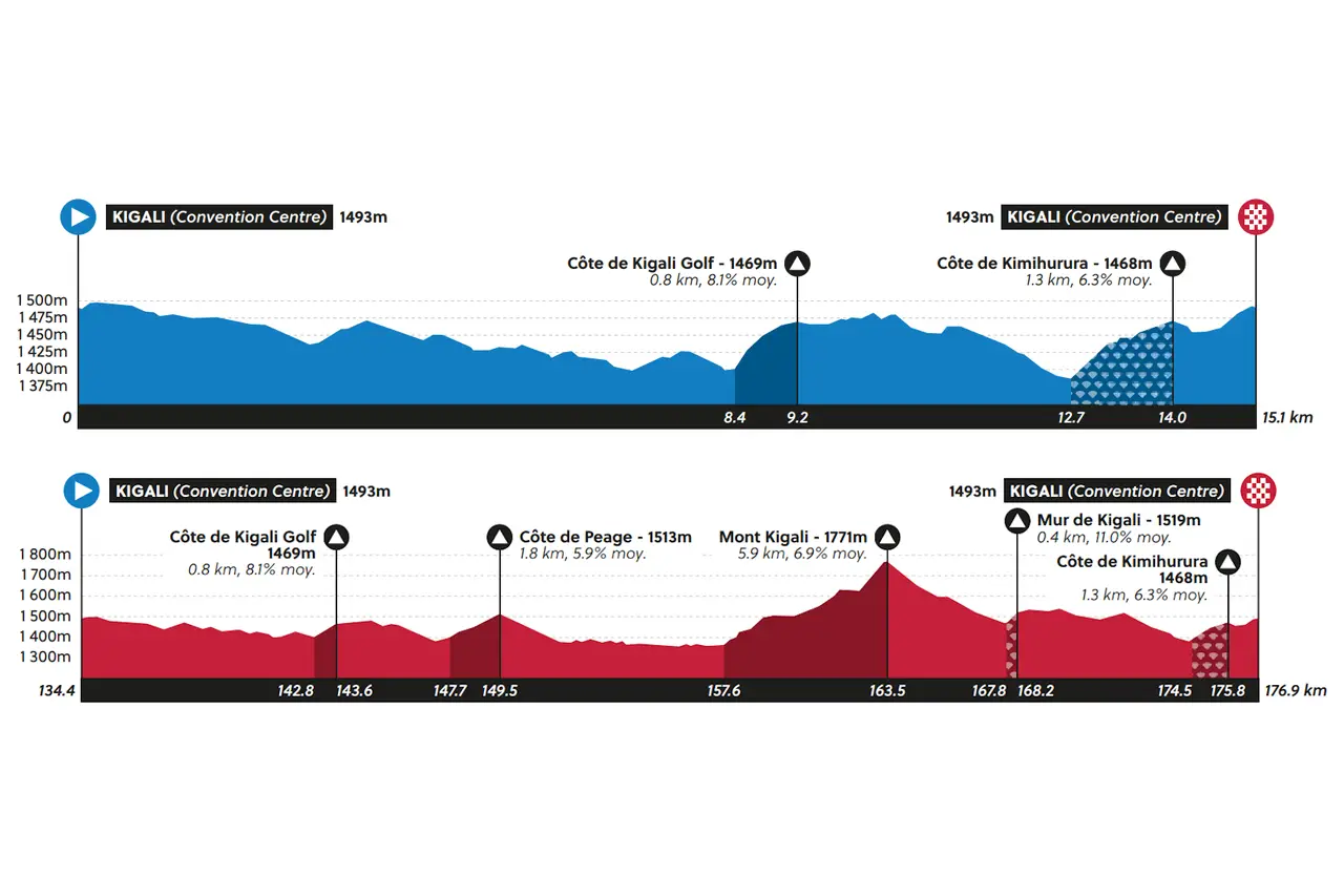 Si affronta un circuito che ricalca nella sostanza i percorsi delle cronometro per donne U23 e uomini Junior, con salita alla Côte de Nyanza seguita dal finale con Côte de Kimihurura e strappo verso il traguardo. Il circuito sarà percorso prima dalla donne e poi dagli uomini per un totale di oltre 40 km con ben 740 metri di dislivello.