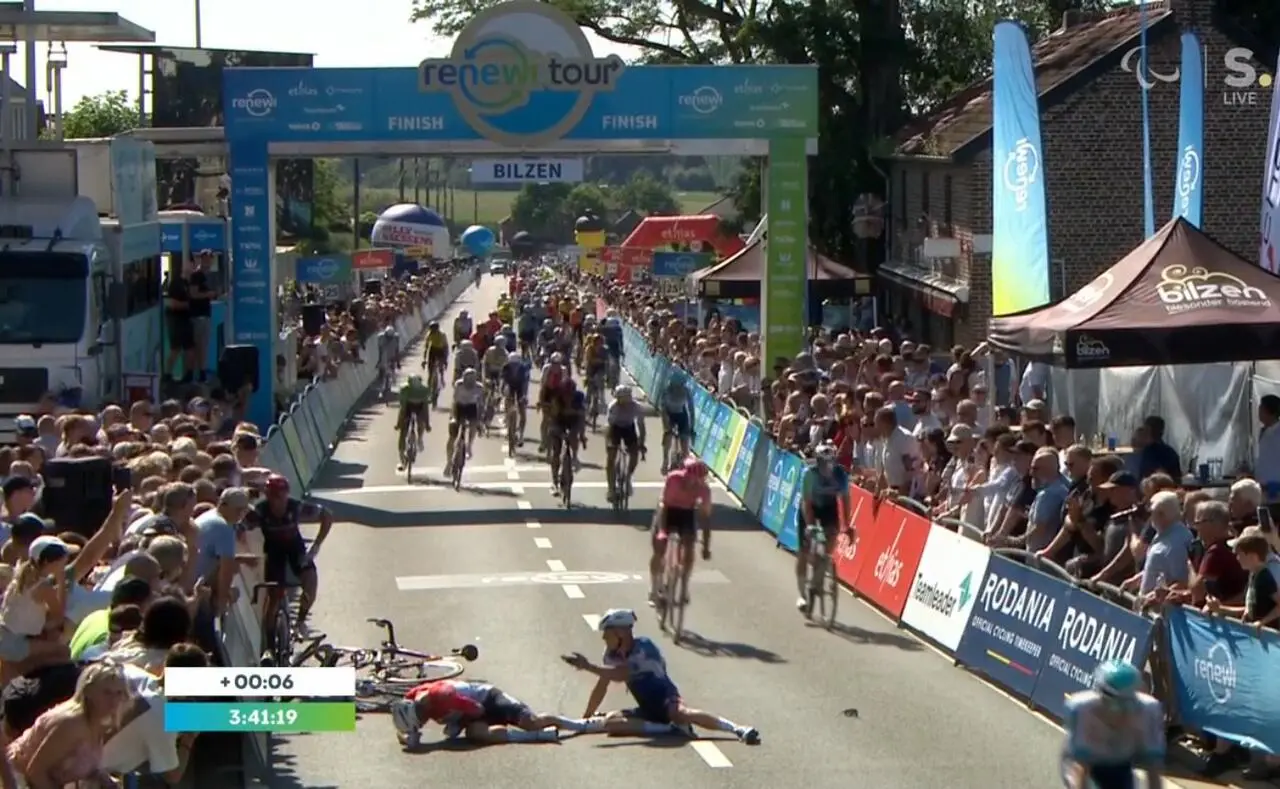 Appena dopo essere transitato in quarta posizione sulla linea del traguardo, Tim Merlier (Soudal Quick-Step) ha innescato una caduta, coinvolgendo anche Dylan Groenewegen (Jayco AlUla). L'olandese è sembrato il più provato e stordito ed è rimasto a terra per diverso tempo, paventando probabilmente la frattura della clavicola. La squadra non ha ancora rilasciato dichiarazioni ufficiali in merito allo stato fisico dello sprinter di Amsterdam. Merlier, invece, sembra aver riportato solamente delle abrasioni sulla schiena, che non dovrebbero pregiudicarne la partenza nella cronometro di domani a Tessenderlo. La giuria di corsa ha comunque deciso di relegare Merlier per la manovra scorretta su Groenewegen.