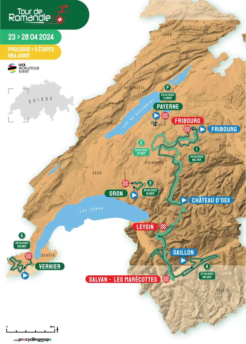 Percorso molto esigente che ogni giorno potrebbe smuovere la classifica; la tappa di muri a Friburgo, la cronometro e gli arrivi in salita a Les Marecottes e Leysin sono i punti salienti