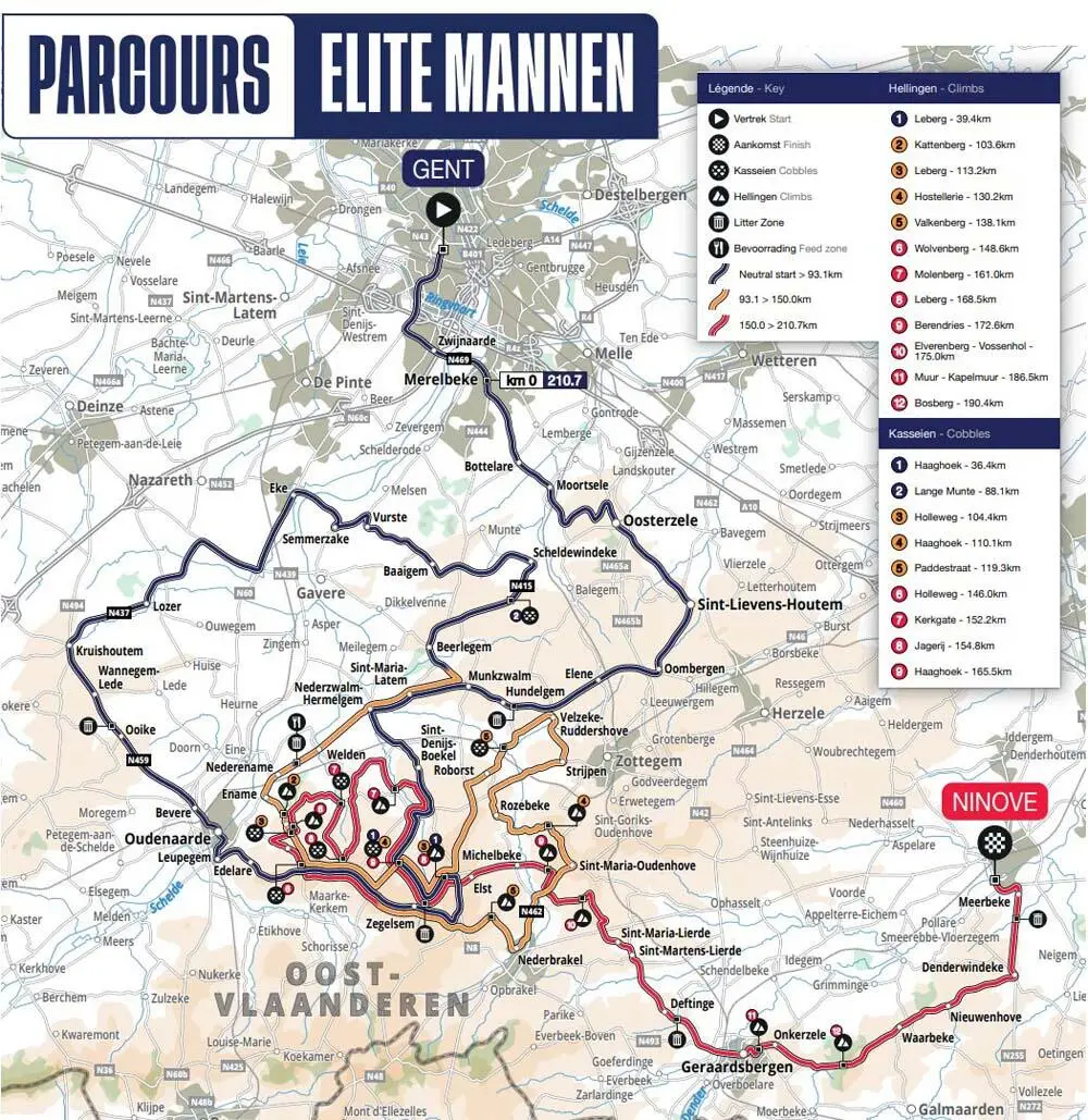 Lungo il percorso i corridori dovranno affrontare nove settori di pavé e dodici muri, con il famigerato Grammont ed il Bosberg a rappresentare le ultime insidie sul cammino della carovana, posti rispettivamente a -15.7 e -11.8 chilometri dalla conclusione.