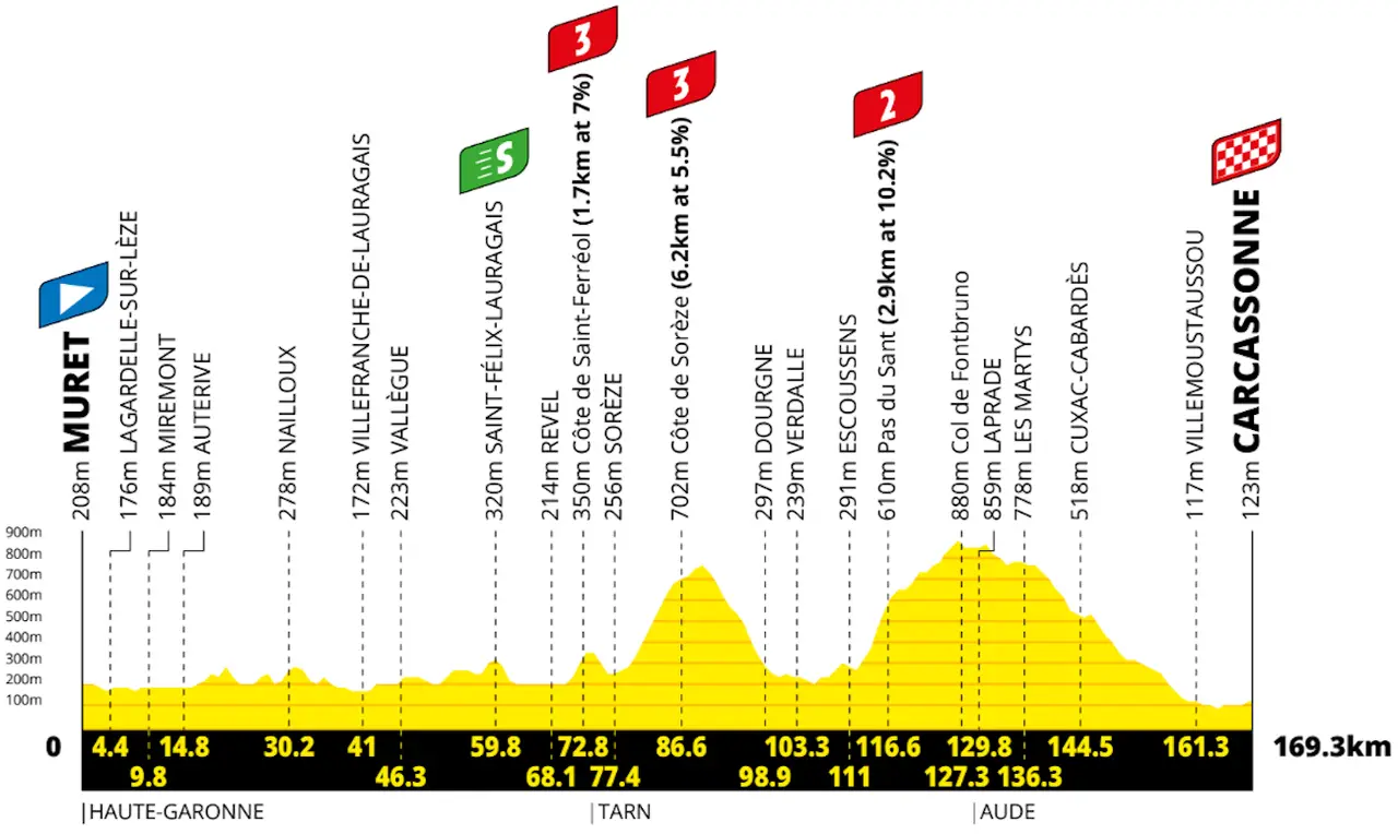 La seconda settimana del Tour de France 2025 è chiusa da una frazione che si allontana dai Pirenei ma non manca di offrire difficoltà importanti, ma se la 15a tappa appare comunque destinata alle fughe in cui i big potrebbero riprendere fiato. Si sommano quasi 2500 metri di dislivello in meno di 170 km. Dopo 15 km iniziano già le prime sensibili ondulazioni: si contano almeno 9 salitelle, di cui l'ultima porta al traguardo volante di Saint-Félix-Lauragais (circa 2.5 km al 3.5%). A Revel si entra nella fase calda della corsa con la Côte de Saint-Ferréol (2.6 km al 5.4%; ultimi 1.8 km al 6.5%, max 8%), subito seguita dalla lunga Côte de Sorèze (6.4 km al 5.7%, max 8%; dopo il GPM ci sono quasi 4.5 km di ulteriore salita pedalabile fino alla Croix de Montalric). Dopo 10 km di discesa e una dozzina di km ondulati si arriva al punto chiave della corsa, la salita al Pas du Sant: dopo quasi 2 km pedalabili (media 3%) inizia la rampa di 3 km al 9.5% (un po' meno ripida del dato ufficiale), molto regolare nella pendenza (max 11%); dopo il GPM non c'è discesa, ma al contrario sale ancora in modo irregolare per quasi 11 km al 2.5% fino al Col de Fontbruno (in tutto 15.5 km al 4%). Anche se mancano 42 km all'arrivo, va detto che la lunga discesa, interrotta di frequente da falsopiani e contropendenze, termina soltanto a 10 km dall'arrivo. Motivo per cui la dura rampa del Pas du Sant non sarà solo determinate per il successo di tappa, ma comunque un punto in cui anche gli uomini di classifica non potranno sottovalutare le mosse degli avversari. Da segnalare infine che il traguardo sarà in lieve ascesa, con l'ultimo km che ha una pendenza media dell'1.5%.