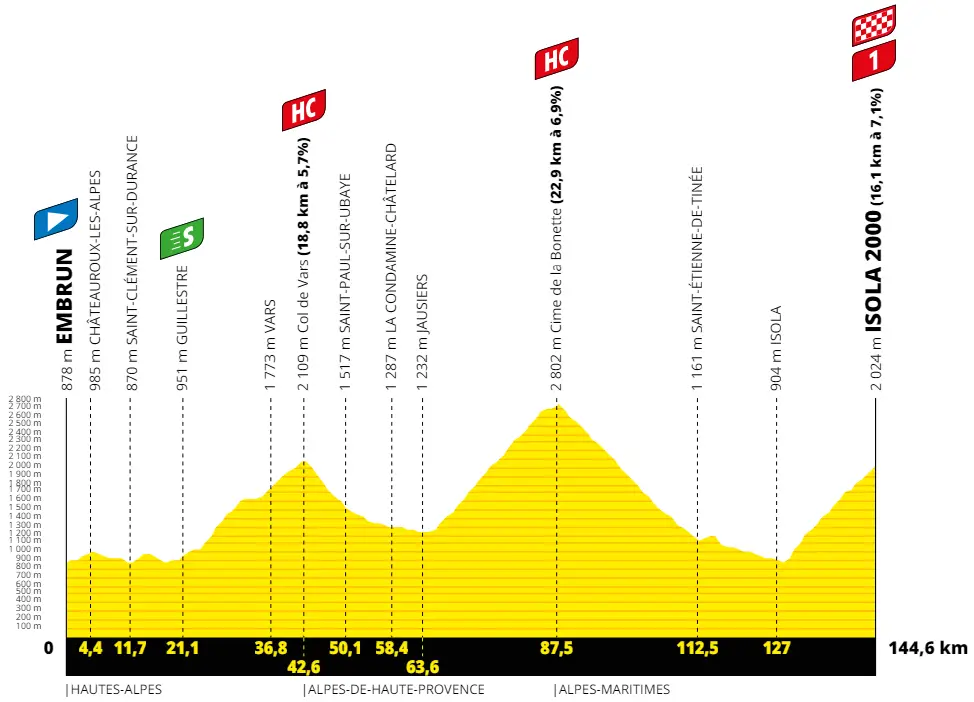 Inizia il gran finale del Tour de France 2024: la 19a tappa è breve ma intensissima sulle grandi vette alpine al confine con l'Italia sommando 4200 metri di dislivello con 3 vette sopra i 2000 metri di quota. Si pare subito all'insù per raggiungere Châteauroux-les-Alpes (circa 2.5 km al 3.5%) e Réotier (circa 2.5 km al 5%), poi attraversare Guillestre (3 km al 4.3%) con il traguardo volante posto a metà salita. Una breve discesa porta all'inizio formale del Col de Vars (18.8 km al 5.7%): molto tosti sono i primi 7.3 km all'8% (max 12%) a cui seguono 4 km abbastanza semplici prima del secondo troncone di 7.4 km al 6.2%. Una decina di km di discesa e un'altra dozzina di fondovalle portano ai piedi dell'infinita ascesa alla Cime de la Bonette (22.9 km al 6.9%): i primi 20 (media 7.1%) sono piuttosto regolari, con frequenti passaggi all'8/9% alternati a qualche respiro, poi con un paio di km molto facile si arriva il colle, dove inizia l'ultima rampa di 1 km al 9.5% per arrivare in vetta. Se uno scalatore avesse da ribaltare la classifica, questa può essere un'ottima occasione, avendo a disposizione 12 km di salita sopra i 2000 metri di quota in cui mettere in crisi gli avversari; lo scollinamento è a 57 km dall'arrivo, ma in verità è più vicino di quello che si può pensare: si incontrano infatti oltre 25 km di discesa piuttosto tecnica su Saint-Etienne-de-Tinée, un tratto di lieve salita uscendo dal paese (2.3 km al 2.7%) e altri 2 km di discesa; di vero fondovalle in cui inseguire ci sono poco più di 10 km, prima che inizi la dura ascesa finale. A Isola 2000 si arriva con 16.1 km al 7.1%: il tratto più duro è il primo di circa 3 km al 9.3% (max 11%), poi la strada rimane al 7% per 3 km per rinforzare nei successivi 1.5 km all'8.7%; la pendenza si ristabilizza al 6/7% per altri 3 km, quindi spiana per 1500 metri (4.3% di media) e risale di nuovo costante intorno al 7% fin sul traguardo negli ultimi 4 km.