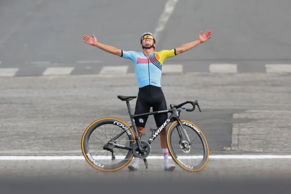 Il vantaggio aumenta rapidamente e supera il minuto negli ultimi 4 chilometri, con Madouas ancora da solo a cercare di resistere al rientro degli inseguitori. Un vantaggio talmente ampio da rendere ininfluente il problema meccanico occorso nel finale, in una scena simile a quella della caduta di Van der Poel a Glasgow, ma con una certa dose di nervosismo tipica della sua debordante personalità. Debordante come il talento del nuovo campione olimpico su strada, che ha tutto il tempo di celebrare la vittoria nel migliore dei mondi, mettendosi in posa a braccia aperte insieme alla sua bicicletta, in uno scatto già immortale.