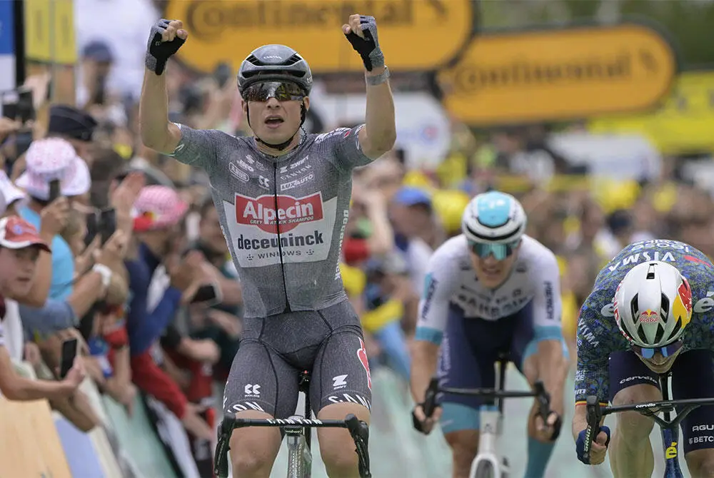 Coinvolti quelli che erano subito dietro, ovvero Cees Bol (Astana), Axel Zingle (Cofidis), e Mattèo Vercher (TotalEnergies), mentre Ryan Gibbons (Lidl) ha evitato il capitombolo con un miracoloso scarto, e De Lie è riuscito a frenare un millesimo di secondo prima di andar giù pure lui. L'incidente ha lasciato davanti appena una quindicina di corridori e ai 300 metri di fatto eravamo già al testa a testa, lanciato da Wout van Aert ma che ha trovato la pronta risposta di Jasper Philipsen (Alpecin), il quale ha avuto la maggior resistenza alla velocità e ha così portato a casa la seconda vittoria al Tour 2024.