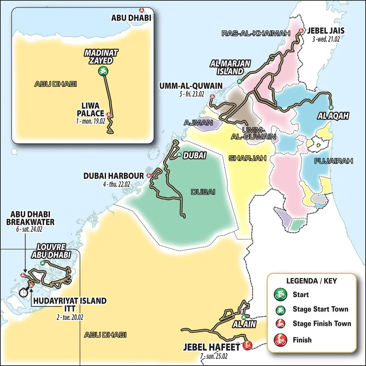 I punti chiave saranno i soliti (cronometro, Jebel Jais e Jebel Hafeet) ma si correrà anche un'inedita tappa sulle dune che potrebbe cambiare le carte in tavola