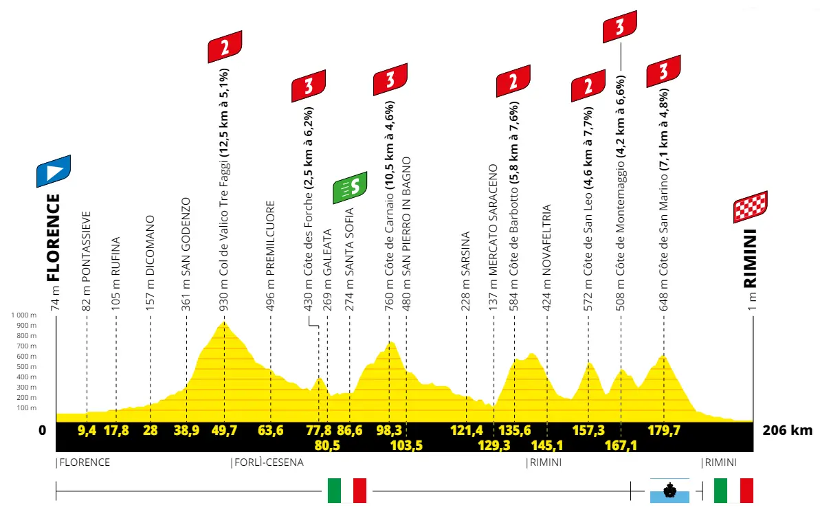 Il Tour de France 2024 comincia subito con una 1a tappa tostissima, di difficile interpretazione, resa un po' meno temibile solo dall'ultima quindicina di km pianeggianti che potrebbero scoraggiare gli attacchi. La tappa è decisamente lunga e il dislivello complessivo è superiore ai 3000 metri (un po' meno dei 3600 indicati ufficialmente) e viene accumulato con una serie di salite sull'Appennino Tosco-Romagnolo, molte delle quali con pendenze piuttosto cattive. Dopo aver risalito la Val di Sieve fino a sfiorare il Mugello si sale al Valico dei Tre Faggi (12 km al 5.6%; tratto di 4 km al 7.2% dopo San Godenzo). 10 km di discesa molto tecnica e un fondovalle molto veloce portano ai piedi del Monte delle Forche (2.5 km al 6.2%) seguito da un'altra discesa insidiosa e soli 6 km di fondovalle, peraltro molto ondulato. Tocca adesso al Passo del Carnaio (10.5 km al 4.6%; tratto di 2 km all'8% quasi subito; ultimo km all'8%, max 10%) con il GPM seguito da altri 1400 metri di salita (2.5% di media) prima della discesa ripida e tecnica su San Piero in Bagno. Si incontra adesso una fase più semplice di circa 25 km in fondovalle a favore, prima della serie di salite conclusiva. Riapre la lotta il Barbotto (4.6 km all'8.2%, ultimo km al 12%), in vetta al quale si svolta a destra salendo di ulteriori 1300 metri fino al GPM (complessivamente 5.9 km al 7.8%). Si sale ulteriormente fino a Perticara (circa 3 km al 3%) prima di scendere a Novafeltria e raggiungere velocemente i piedi della salita a San Leo (4.6 km al 7.7%, max 12%), cui seguono immediatamente (intervallate da discese insidiose) le salite a Montemaggio (4.2 km al 6.6%, max 10% a inizio salita) e San Marino (7.1 km al 4.8%, max 7%). Mancano ormai soltanto 26.3 km al traguardo e almeno 10 sono di discesa. Gli ultimi 16 sono quasi completamente rettilinei, sicuramente non favorevoli ad eventuali attaccanti, ma tutti in lievissima discesa, dunque molto veloci. Più tortuosi sono gli ultimi 3.5 km con molte rotonde e una doppia curva a sinistra dopo la flamme rouge; il rettilineo di arrivo misura 850 metri. La durezza c'è tutta, ma l'ultima salita non è sicuramente durissima e comunque relativamente distante dall'arrivo, soprattutto essendo la 1a tappa. In ogni caso a Rimini non ci sarà una volata a ranghi compatti.