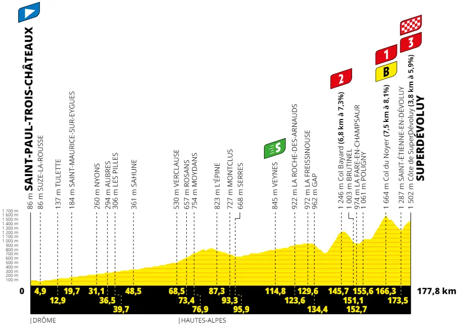 Alla 17a tappa del Tour de France 2024, con i Pirenei appena lasciati alle spalle, è già tempo di approdare sulle Alpi, con una frazione “introduttiva” sul massiccio del Dévoluy che consente finalmente di riproporre il versante tosto dell'affascinante Col du Noyer anche alla Grande Boucle. I primi 140 km scarsi che portano a Gap sono di fondovalle: si supera solo il Col de la Saulce (circa 15.5 km al 2.2%, con tratti al 4/5% alternati ad altri di pianura o lieve discesa) poco prima di metà corsa. Tutto è concentrato negli ultimi 40 km (circa 1500 metri di dislivello) dove si percorrono in successione le tre salite di giornata. Si comincia con il Col Bayard (6.8 km al 7.3%) con pendenze costanti al 7% fino ad una rampa di circa 1500 metri al 10% che termina poco prima del GPM. La successiva discesa non rappresenta un fattore essendo quasi completamente rettilinea, poi si incontra lo strappo di Poligny (circa 1.5 km al 6%, max 10%); un tratto ondulato di 2.5 km e una brevissima discesa porta all'imbocco del Col du Noyer (7.5 km all'8.1%), subito ripido per 500 metri, poi più pedalabile per 1 km prima di stabilizzare la sua pendenza intorno all'8/9%; la strada impenna per gli ultimi 2 km fuori dalla vegetazione con una media del 10% e punte fino al 14%. Lo scollinamento a soli 11.5 km dal traguardo la rende un ottimo punto per tentare un attacco e saggiare le gambe degli avversari all'inizio della terza settimana. La discesa, pedalabile ma piuttosto insidiosa, porta direttamente ai piedi dell'ultima risalita fino alla stazione sciistica di SuperDévoluy in 3.8 km al 5.9% (max 10% nella primissima parte; la pendenza diminuisce man mano che ci si avvicina al traguardo).