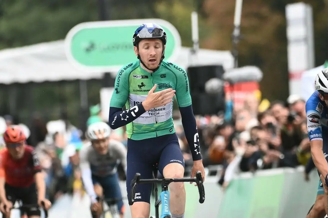 Quando è iniziata la salita di Hound Hill anche gli ultimi fuggitivi sono stati ripresi. Ha provato un allungo Thomas Pidcock, subito rintuzzato prima da Oscar Onley (DSM-firmenich PostNL) e poi da Williams, mentre Alaphilippe ha dovuto mollare. La volata è stata molto disordinata, con Markus Hoelgaard (Uno-X Mobility) che ha provato forzare da lontano senza successo, e dopo di lui è stato Edoardo Zambanini (Bahrain Victorious) a lanciare lungo lo sprint prendendo in testa l'ultima curva. Negli ultimi metri è poi uscito Williams che lo ha preceduto: da dietro è arrivato anche Paul Magnier (Soudal Quick-Step). Zambanini si è arrotato con lui a pochi metri dal traguardo, rischiando di scivolare sul bagnato, ma si è salvato tagliando il traguardo con un piede fuori dall'attacco.