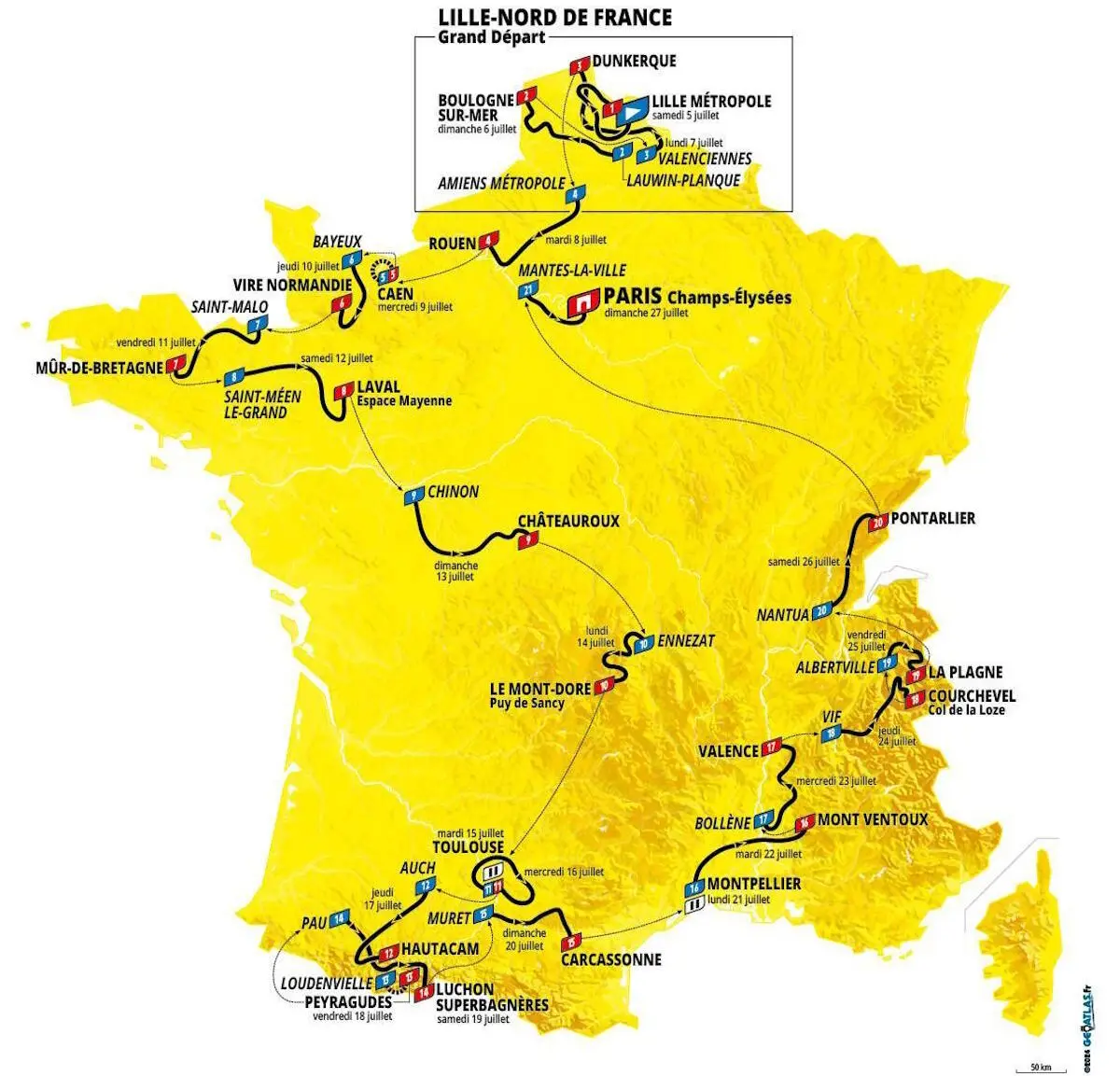 Ormai ci siamo: il Tour de France 2025 sta per iniziare e noi vi proponiamo come sempre una dettagliatissima analisi del percorso. Anche se le prime giornate si svolgono al nord, in verità di 11 tappe che precedono i Pirenei solo 4 sono per velocisti puri e talvolta anch'esse non mancano di ostacoli: in mezzo a queste ci sono 4 tappe molto mosse con arrivi su strappi, le prime montagne sul Massiccio Centrale e una tappa mossa con finale pianeggiante a Tolosa. Tutte le grandi montagne (Pirenei, Ventoux e Alpi) sono invece inserite in 6 tappe di alta montagna, concentrate in soli 9 giorni. Il tracciato si preannuncia dunque intrigante e povero di giornate davvero insignificanti, anche se un po' più di km a cronometro non avrebbero guastato.