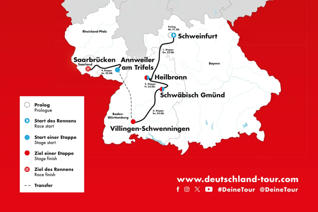 Il percorso del Deutschland Tour 2024 presenta grosso modo la stessa struttura delle ultime edizioni, con il prologo seguito da quattro tappe in linea. Si ritorna però nel complesso ad un disegno più simile a qualche anno fa, con tutte le tappe variamente mosse, senza una vera tappa regina, né tantomeno un arrivo in salita importante come avvenuto nel 2022. Tutte le tappe offrono salite ripide in cui inventarsi qualcosa, ma spesso lontane dal traguardo: vedremo se questo stimolerà la fantasia o se assisteremo a quattro volate a ranghi ristretti.