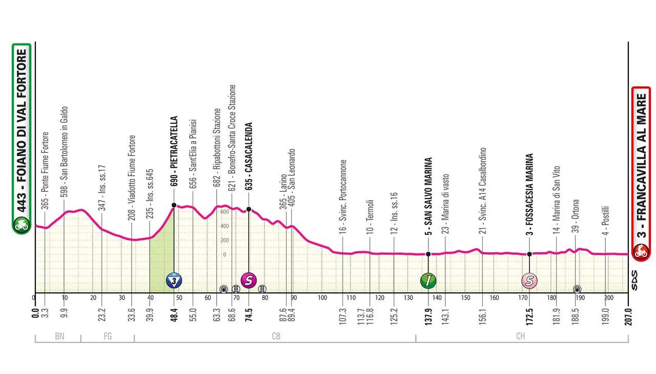 Nell'11a tappa del Giro d'Italia ornano di scena i velocisti in una frazione lunga, ma priva di grandi difficoltà. L'avvio nel cuore dell'Appennino costringe ad avere una partenza complicata, con le salite a San Bartolomeo in Galdo (circa 6.5 km al 3.5%), al GPM di Pietracatella (8.5 km al 5.4%, max 10%) e a Ripabottoni Stazione (circa 4 km al 5%). Segue un lungo tratto a scendere che conduce sul mare, per percorrere gli ultimi 100 km completamente pianeggianti lungo l'Adriatico. Da fare attenzione soltanto al vento che potrebbe condizionare in parte questo tratto. Anche da un punto di vista planimetrico il finale è semplicissimo, con sole due curve a destra ad angolo retto che dalla SS16 conducono sulla retta conclusiva di 3.5 km completamente rettilinei.