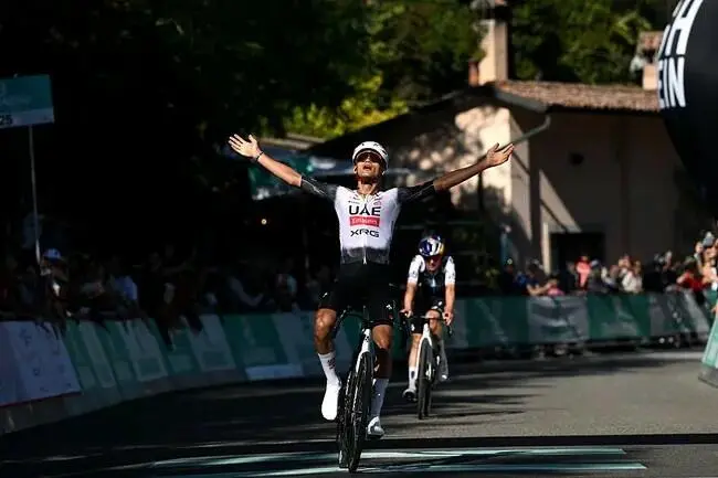 Il messicano della UAE vince di squadra, gamba e furbizia sulla mitica ascesa al Santuario: battuto Pidcock in volata, terzo un troppo generoso Martinez