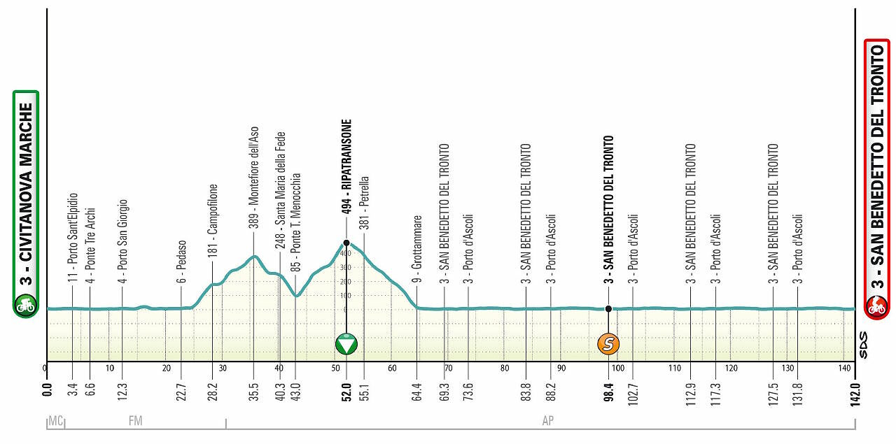 Classica tappa lunghissima per velocisti ma con tanto dislivello tracciata pensando alla Sanremo. Dopo 30 km si incontrano le prime ondulazioni con lo strappo di Monte Buono (300 metri al 12%), quindi le salite di Pietraia (1 km al 5%), Spina (1.4 km al 4.6%) e Cerqueto (2.3 km al 4.9%, primi 1200 metri al 7%). Dopo altri 20 km quasi pianeggianti si sale a Todi (2.5 km al 5.2%), quindi si incontra un tratto ondulato, una dozzina di km in fondovalle e la salita al sito archeologico di Carsulae (circa 3.5 km al 4.3%). Dopo una lunga discesa si arriva a Terni, per poi fare la salita delle Marmore (6.5 km al 3.8%). Si respira per quasi 40 km prevalentemente pianeggianti, prima di salire ancora fino allo svincolo di Petrella del Salto (6 km al 4.2%), dove però non ci sarà discesa, ma altri 16 km ondulati fino al Bv. per Spedino. Qui la strada scende molto dolcemente (tutta da pedalare) per 3 km, prima dell'ultima decina di km perfettamente pianeggianti. Qualche velocista potrebbe essersi perso per strada e quello che hanno resistito potrebbero piantarsi sulla sensibile pendenza che porta al traguardo (ultimi 750 metri al 2.7%).