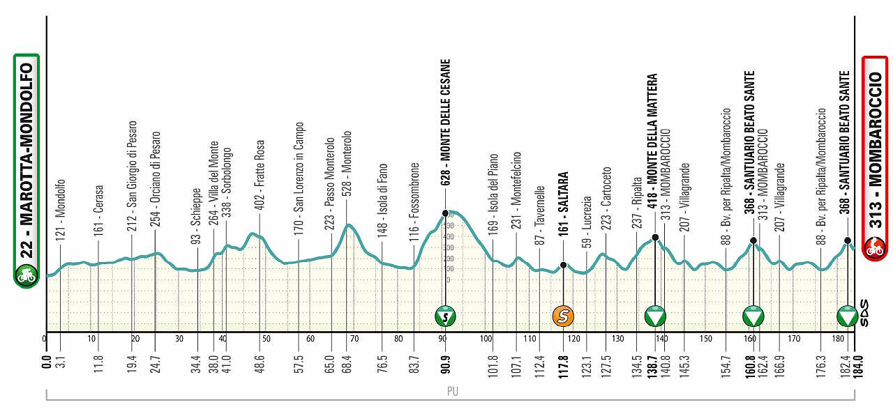 Ecco la prima delle due frazioni decisive, che con salite di media lunghezza ma pendenze cattive, accumula quasi 4000 metri di dislivello. Si parte praticamente in salita, incontrando quasi subito quella di Stacciola (2.8 km al 4.2%), seguita da quasi 20 km di continui su e giù che sull'altimetria sono impercettibili. A Orciano di Pesaro inizia una discesa di 4 km, quindi un breve tratto pianeggiante prima di salire a Villa del Monte (1.8 km al 9%, max 22%); in vetta al muro si incontra un tratto ondulato prima di una nuova rampa verso Santa Vittoria (1.8 km all'8.4%, max 12%). Si respira grazie a 7 km di discesa e una dozzina di pianura prima di salire a Monterolo (3.5 km all'8.6%, massime che sfiorano il 20%). Con 8 km di discesa e 7 di pianura si arriva ai piedi della salita più dura del giorno, il Monte delle Cesane (7 km al 7.2%, molto irregolari; primo tratto di 2.3 km all'11%, max 18%). Dopo 3 km di altopiano comincia una discesa tecnica di 8 km, quindi dopo un breve tratto lievemente mosso ecco il muro di Montefelcino (800 metri al 12%, max 20%). Si respira per 8 km e poi si sale al traguardo volante di Saltara (1.8 km al 5.6%, ma con due brevi rampe al 15%). Un ultimo tratto agevole di 5 km precede l'inferno conclusivo, che inizia con la salita di Salomone (2.6 km al 6.6%, max 15%), subito seguita da quella a Monte della Mattera (in tutto 6.3 km al 5.2%, quindi qualcosa meno del dato ufficiale, ma estremamente irregolare, con almeno 5 strappi ripidi, max 17%). Si scende su Mombaroccio dove si supera uno strappo di 300 metri al 7.5% che porta al traguardo. Qui iniziano i due giri conclusivi: la discesa di 6.5 km è spezzata dallo strappo di Villagrande (600 metri al 12%), poi si sale subito all'Alberone (1.6 km al 5.9%, max 13%); 7 km ondulati precedono la salita finale al Santuario Beato Sante (4.2 km al 6.4%; con un primo troncone di 1.3 km al 9.3% e un secondo di 1.2 km al 9.6%, max 19%). Tutta questa dolce follia da ripetere due volte termina a soli 1600 metri dal traguardo, posto di nuovo in cima allo strappo di 300 metri.