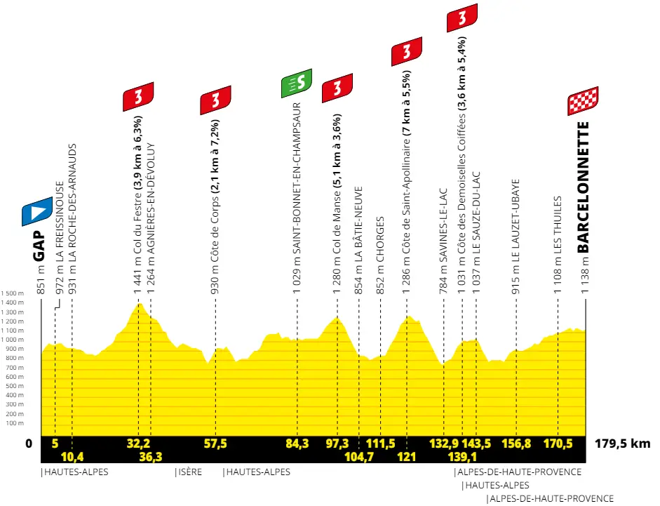 La 18a tappa del Tour de France 2024 plausibilmente non sarà una frazione adatta per fare classifica, ma in ogni caso è un continuo susseguirsi di salite e discese che non consentirà di rifiatare molto prima delle ultime tre tappe decisive. In fondo si pedalerà per circa 180 km accumulando quasi 3000 metri di dislivello. Si parte in salita con un tratto di circa 3 km al 4.5% e poco dopo si sale al Col du Festre (più lunga del dato ufficiale, 14 km al 4.2% con un tratto di 3 km al 7% che termina a 1.5 km dalla vetta). Lo strappo della Côte de Corps (2.1 km al 7.2%) e la salita non segnalata di Les Costes (6.5 km al 4.2% in due gradoni al 7/8%) portano sull'altopiano dello Champsaur, da cui si esce superando il Col de Manse (5.1 km al 3.6%) con la relativa discesa molto tecnica (diversa però da quella celeberrima sul Gap). Si incontra quindi la salita più dura del giorno, ovvero la Côte de Saint-Apollinaire (7 km al 5.5%; tratto di 1.5 km all'8% a 2.5 km dalla vetta) a 58.5 km dal traguardo. Dopo un'altra discesa insidiosa si incontra l'ultima salita, la Côte de Demoiselles Coiffées (3.6 km al 5.4%). In realtà dopo la discesa la strada sale ancora per raggiungere Barcellonette: per arrivare a Le Lauzet-Ubaye si incontra un tratto in salita di oltre 3 km intorno al 4% di media e poi la strada prosegue in lieve ma inesorabile ascesa per poco meno di 20 km, fino all'ultimissimo tratto più propriamente pianeggiante. Un ultimo zampellotto che termina a 3 km dall'arrivo potrebbe essere un buon trampolino di lancio; in cima si svolta a sinistra e poi si raggiunge il traguardo senza grandi ostacoli; solo una lieve curva riduce il rettilineo di arrivo a soli 250 metri. Sarà presumibilmente una tappa da fughe, ma questo non per forza si traduce in un giorno di trasferimento in cui il gruppo può respirare: ce lo dimostra la tappa appena terminata.