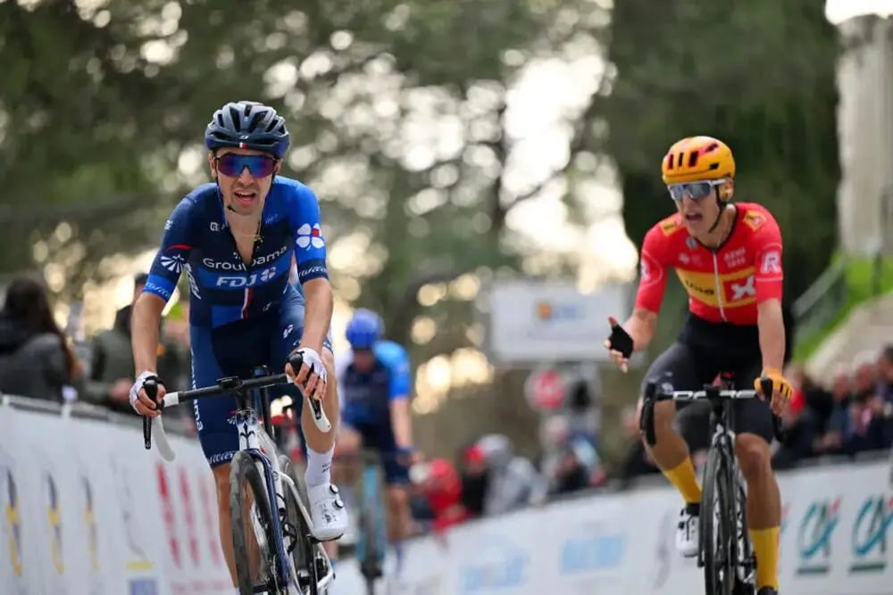 Si procede quindi a suon di allunghi anche all’interno dell’ultimo chilometro, con 6 battistrada che non riescono a fare la differenza l’uno sull’altro, almeno fino a quando Romain Bardet (DSM), rimasto sempre sulle ruote, lancia un attacco deciso. L’esperto francese sembra avere la vittoria in pugno, quando Tobias Johannesen (Uno-X) lo riprende e s’invola verso la vittoria. Il norvegese ha qualche metro di vantaggio su tutti ed esulta, ma scambia il cartello che indica 25 metri alla conclusione per il traguardo stesso. Ne approfitta così Lenny Martinez (Groupama-FDJ), che supera agevolmente il rivale che sta ancora festeggiando. Vittoria dunque a Martinez, secondo Johannesen che si rende conto immediatamente della fatale distrazione, terzo posto a Bardet.