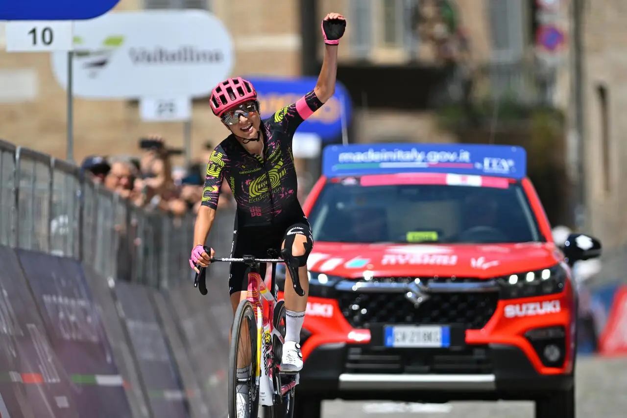 Gli ultimi 500 metri, quelli che portano al traguardo posto nel centro storico di Urbino sono davvero impegnativi e ricordano molto l’arrivo delle strade bianche. Nel gruppo delle inseguitrici, Soraya Paladin anticipa tutte scattando sulla parte più ripida del muro finale. Edmond appare appesantita, ma il vantaggio accumulato le è sufficiente per contenere l’arrivo delle contrattaccanti. Sul traguardo la canadese può finalmente alzare le braccia al cielo a coronamento di una giornata fenomenale. Oltre alla splendida vittoria, grazie alla lunga fuga di giornata conquisterà anche la maglia Azzurra di leader della classifica GPM. Dietro di lei arriva Paladin a 17” e terza Ludwig a 20”. Da segnalare il sesto posto di Giada Borghesi.